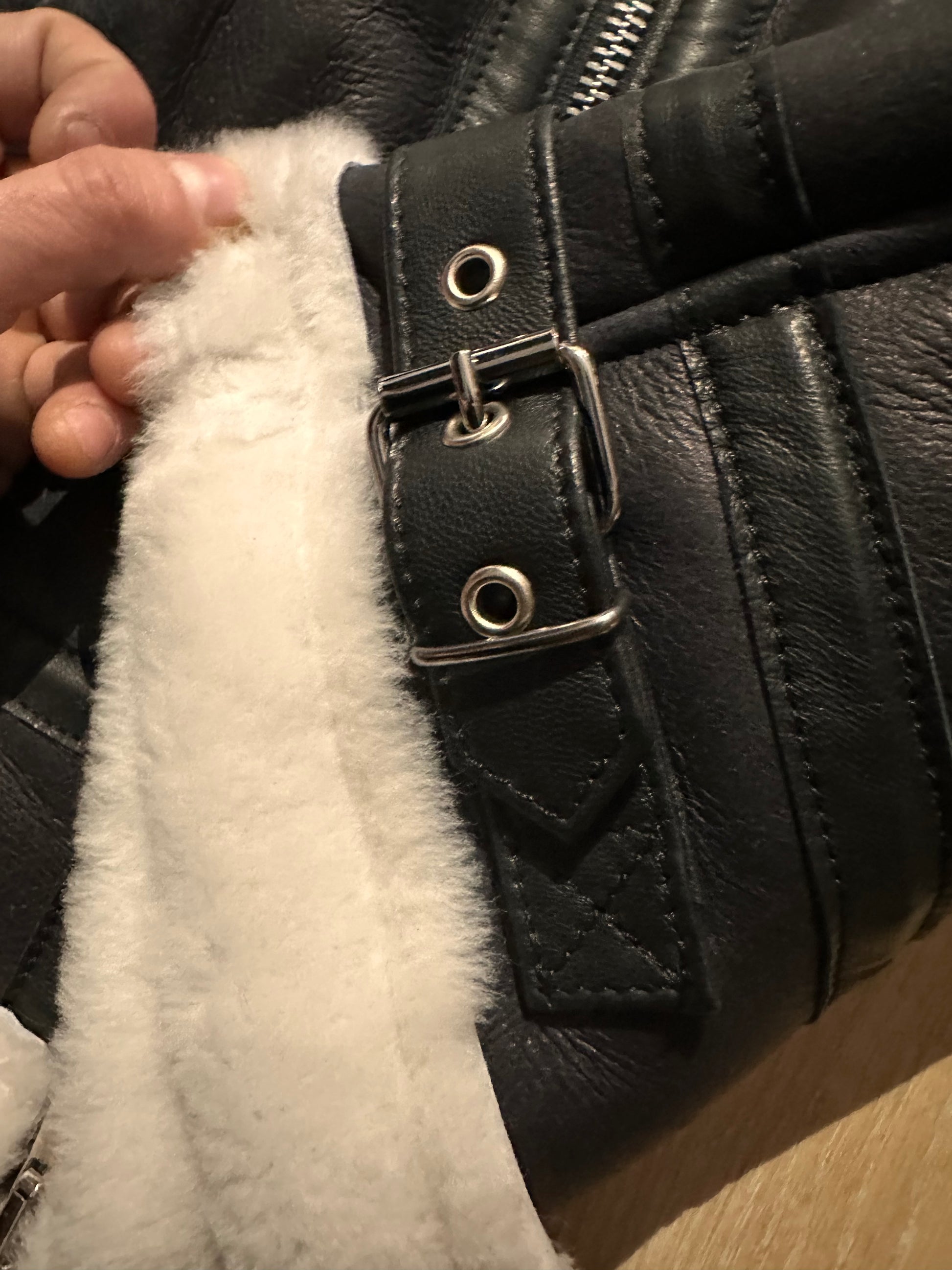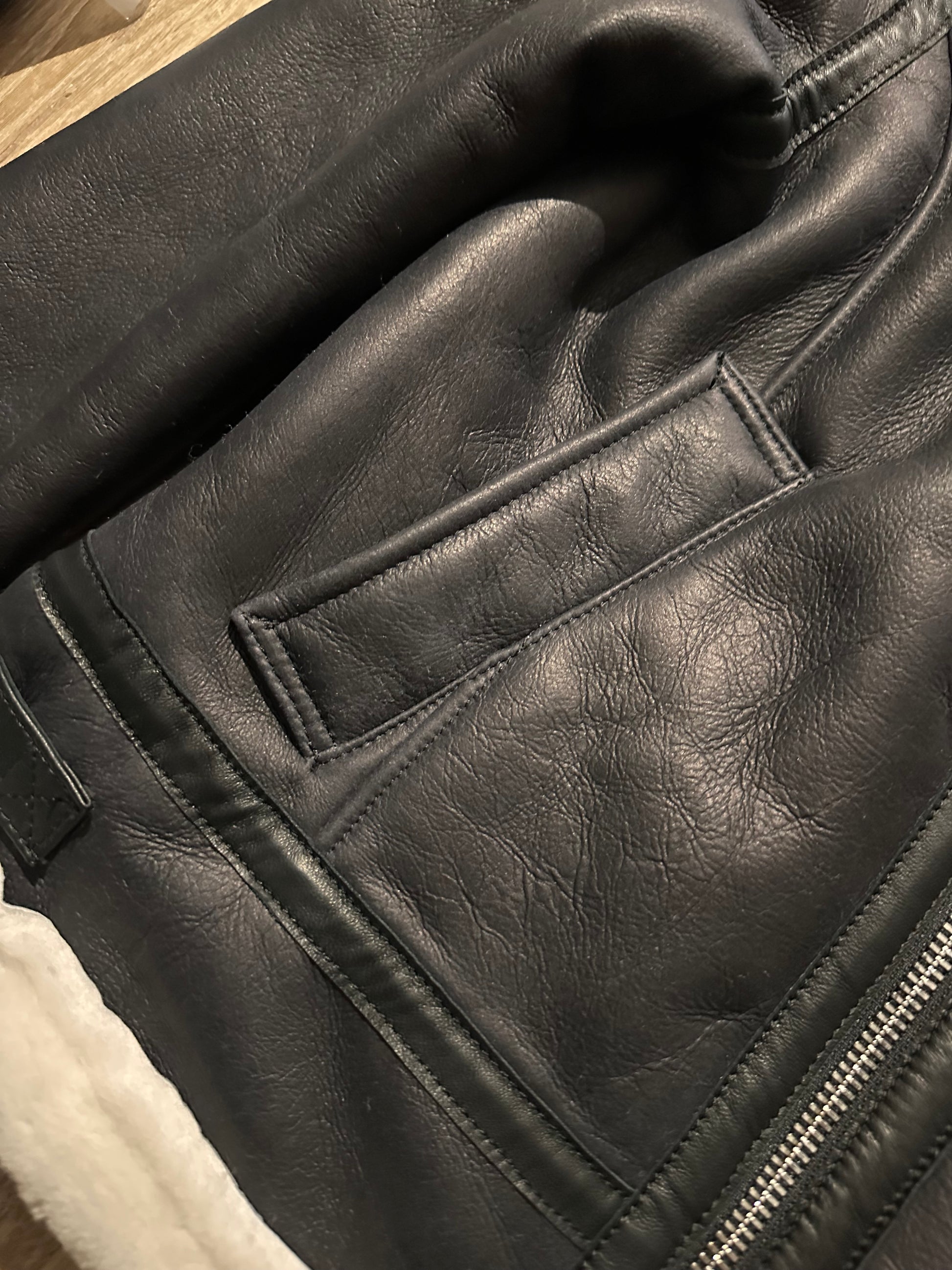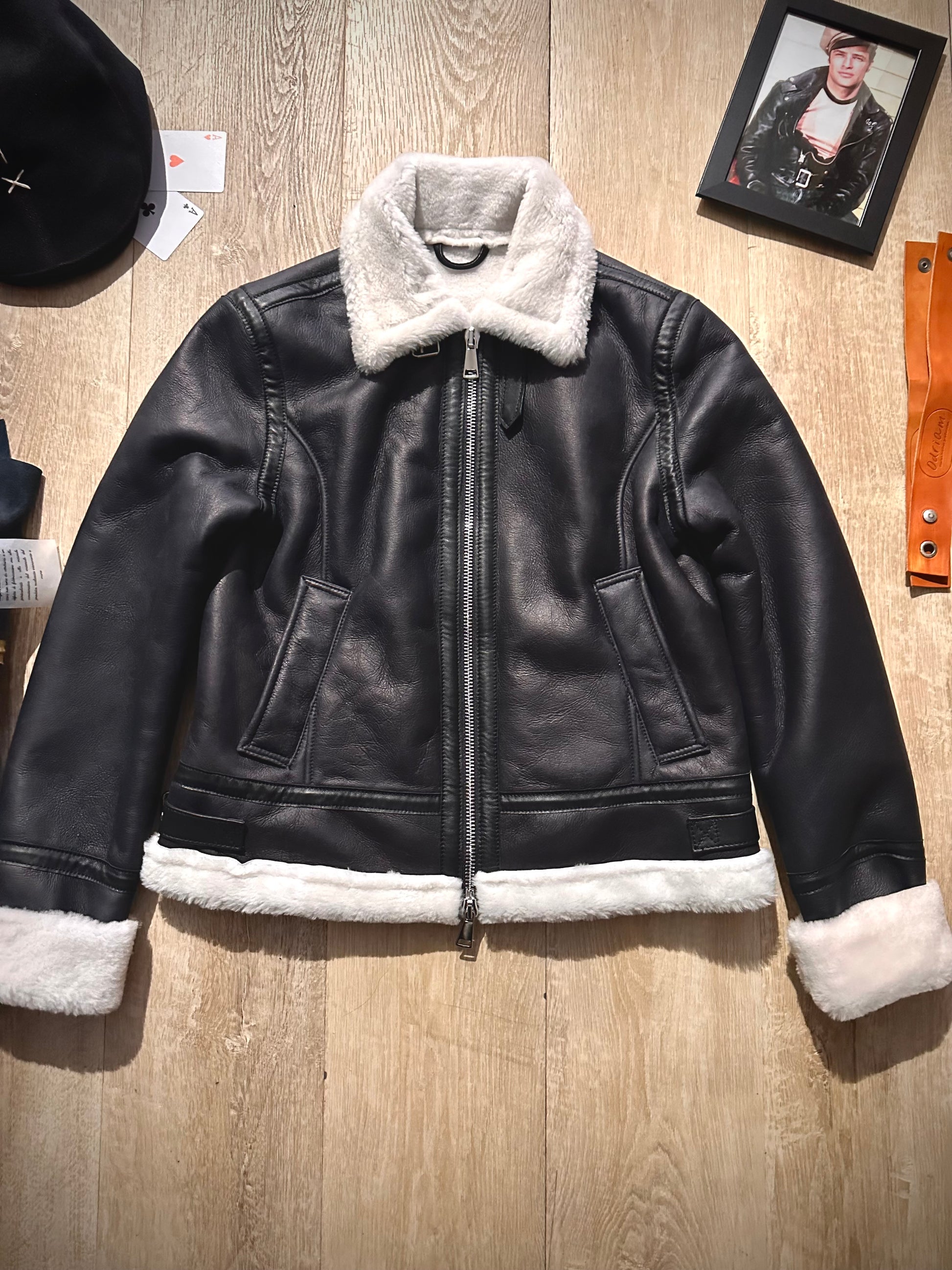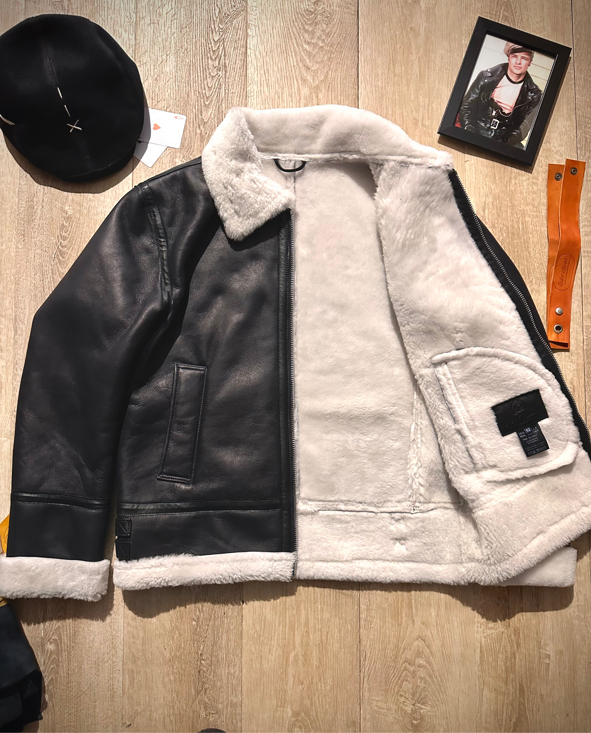 The Aviator Herita Jacket is an elegant black sheepskin jacket, crafted from the highest-quality materials sourced from the finest tanneries in Solofra, renowned for their artisanal leatherwork. This piece features a soft interior and a white fur collar, which contrast beautifully with the black leather exterior.