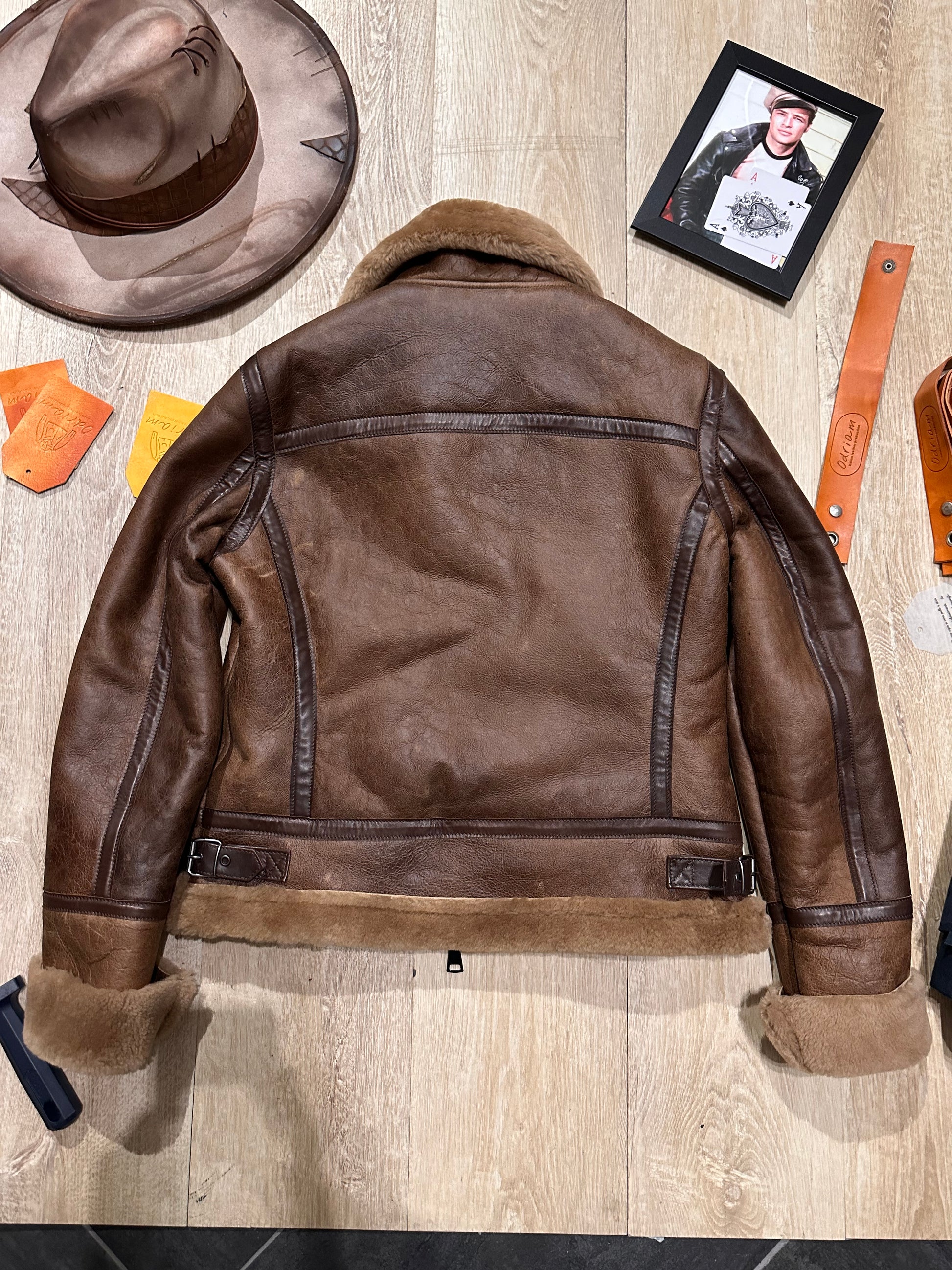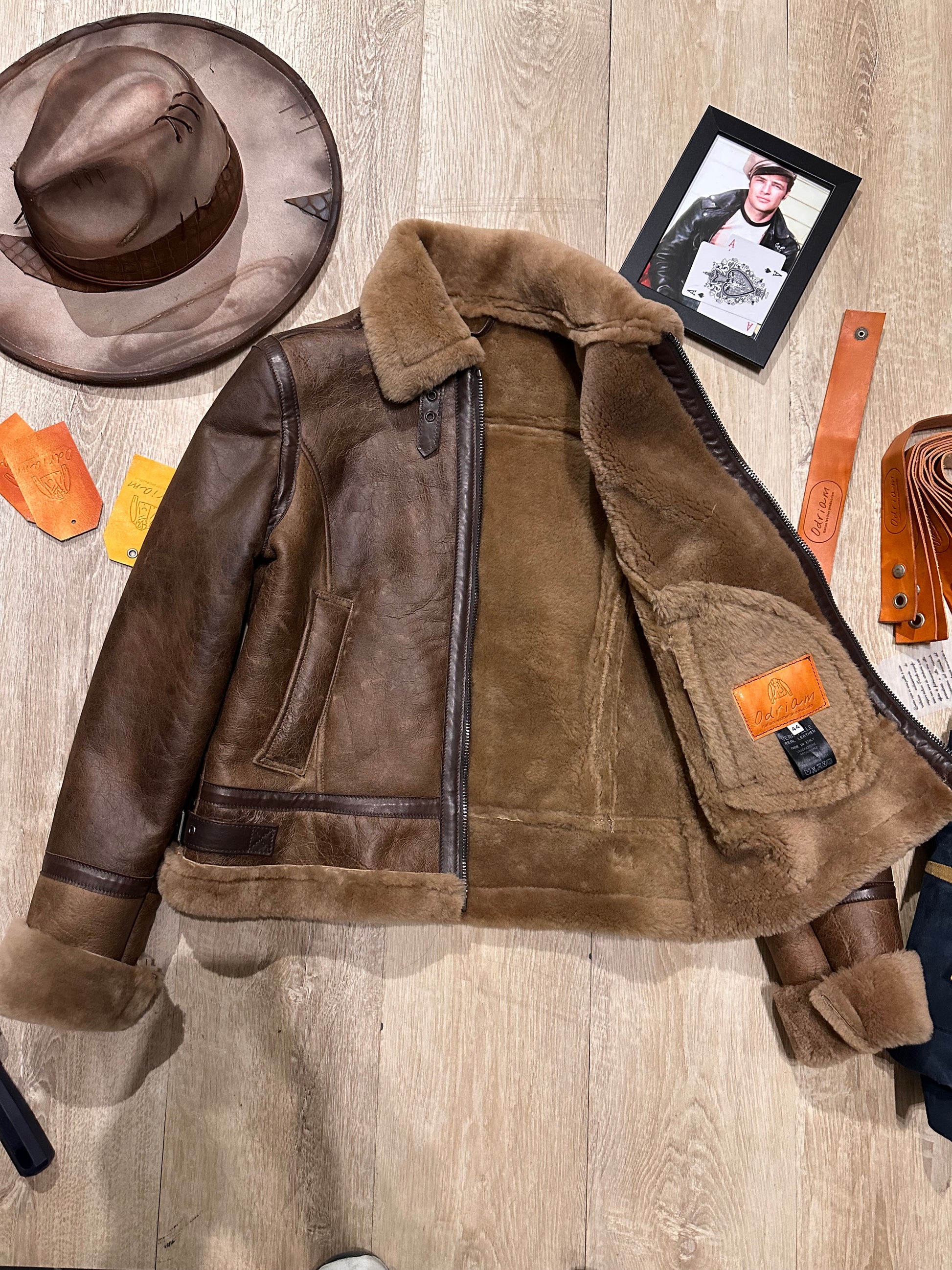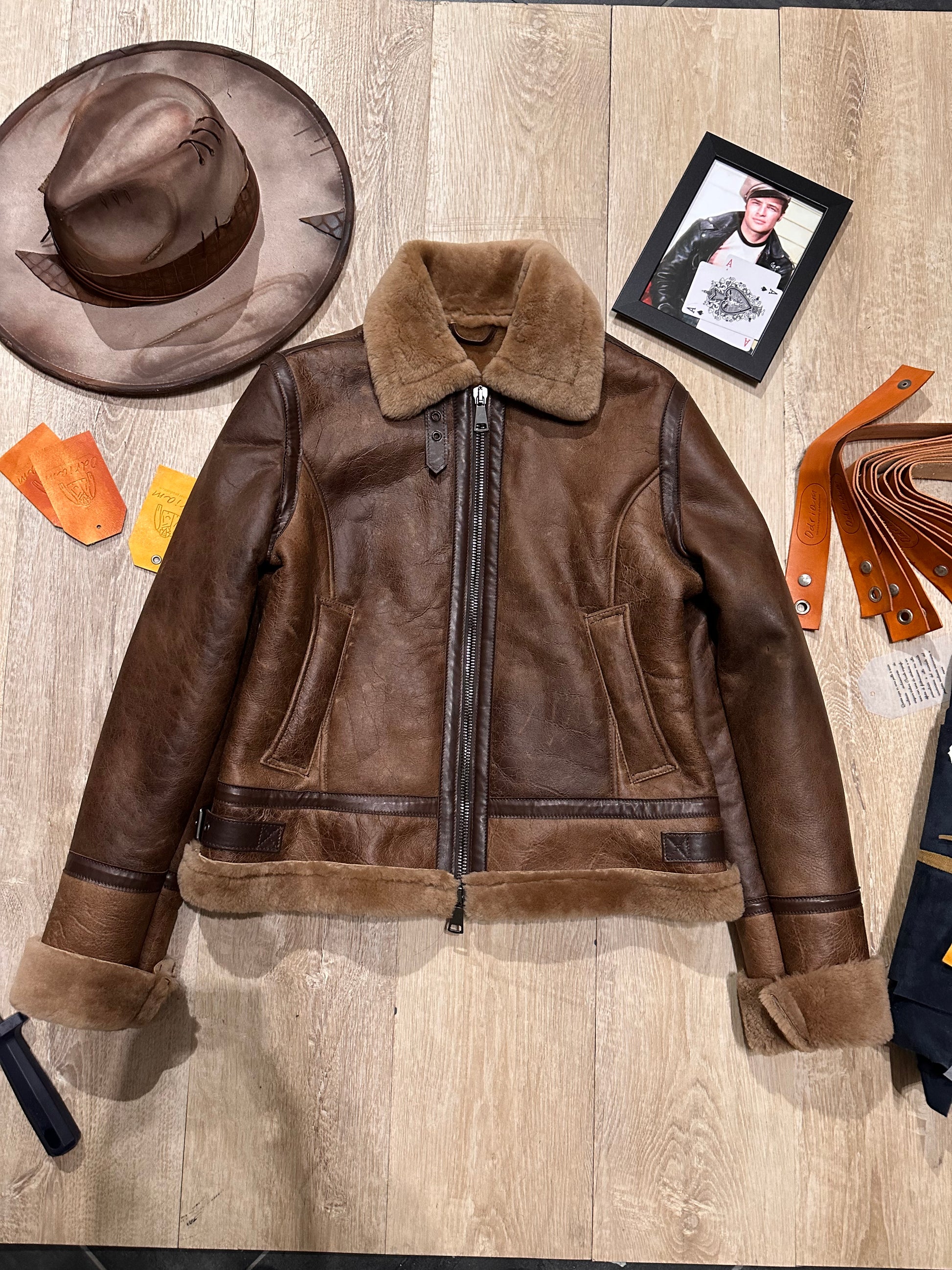 This authentic shearling jacket, crafted from premium sheepskin with a soft natural shearling lining, is inspired by the aviator jackets worn by pilots during World War II. Its silhouette evokes classic military style, with rugged details like the high collar and rolled cuffs, designed to provide extreme warmth in unpressurized cockpits. The vintage brown tones and slightly distressed finish accentuate its retro appeal, making it a tribute to the golden age of aviation.