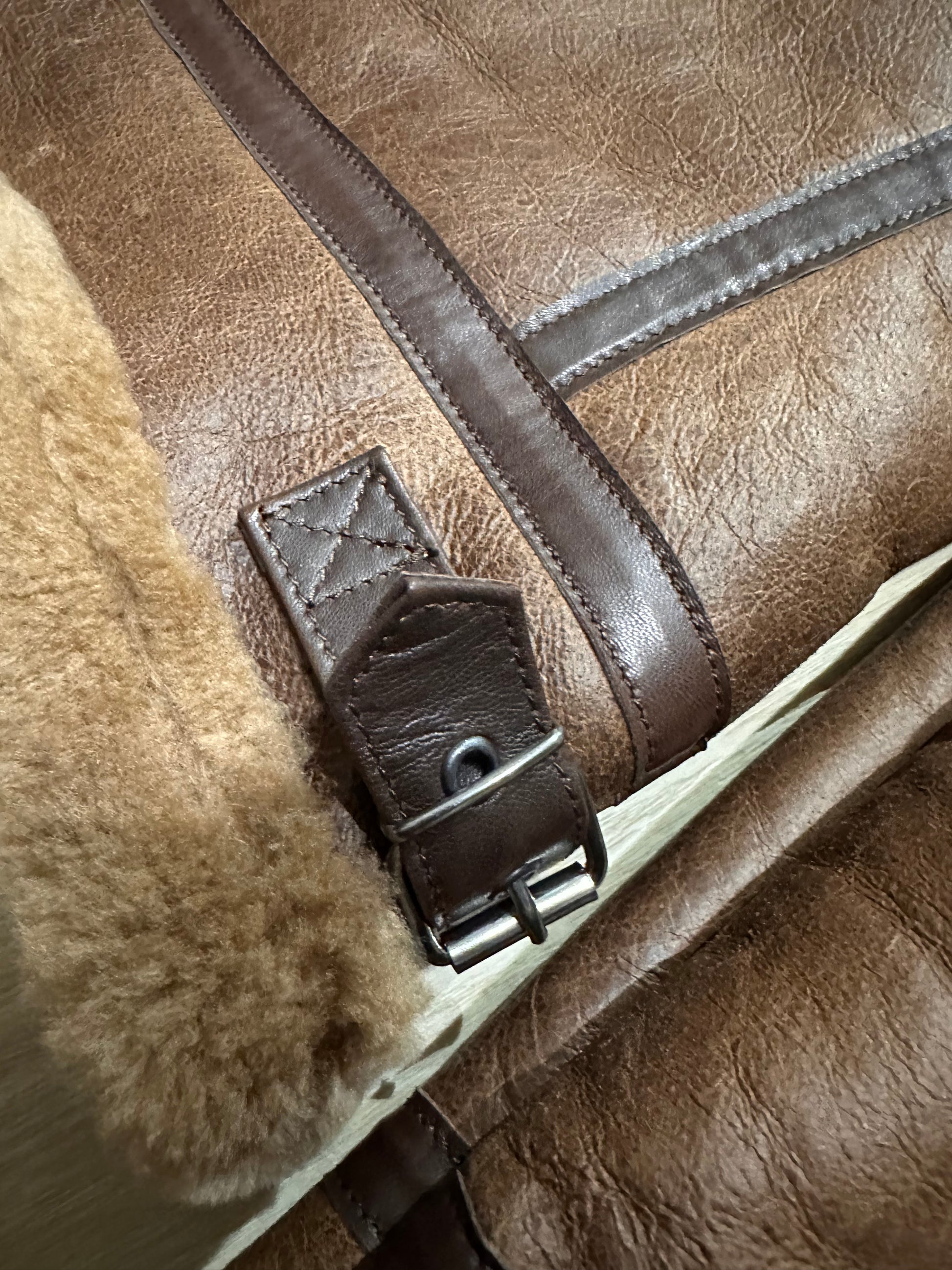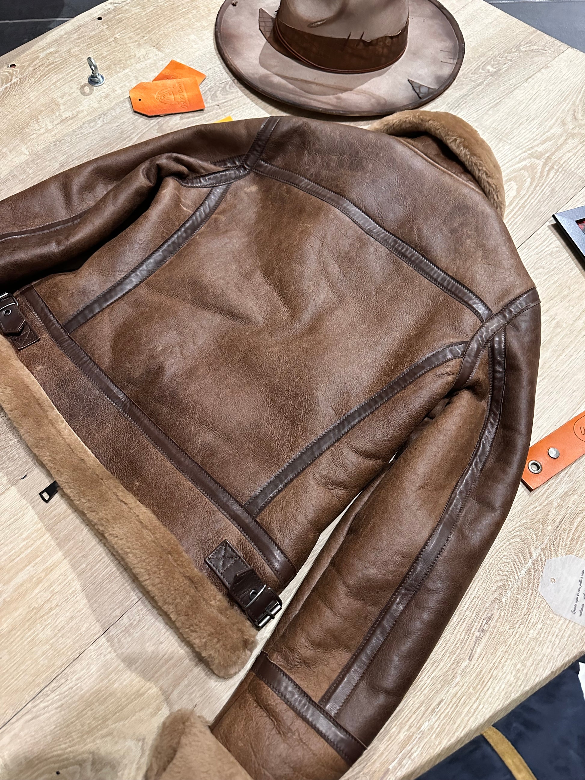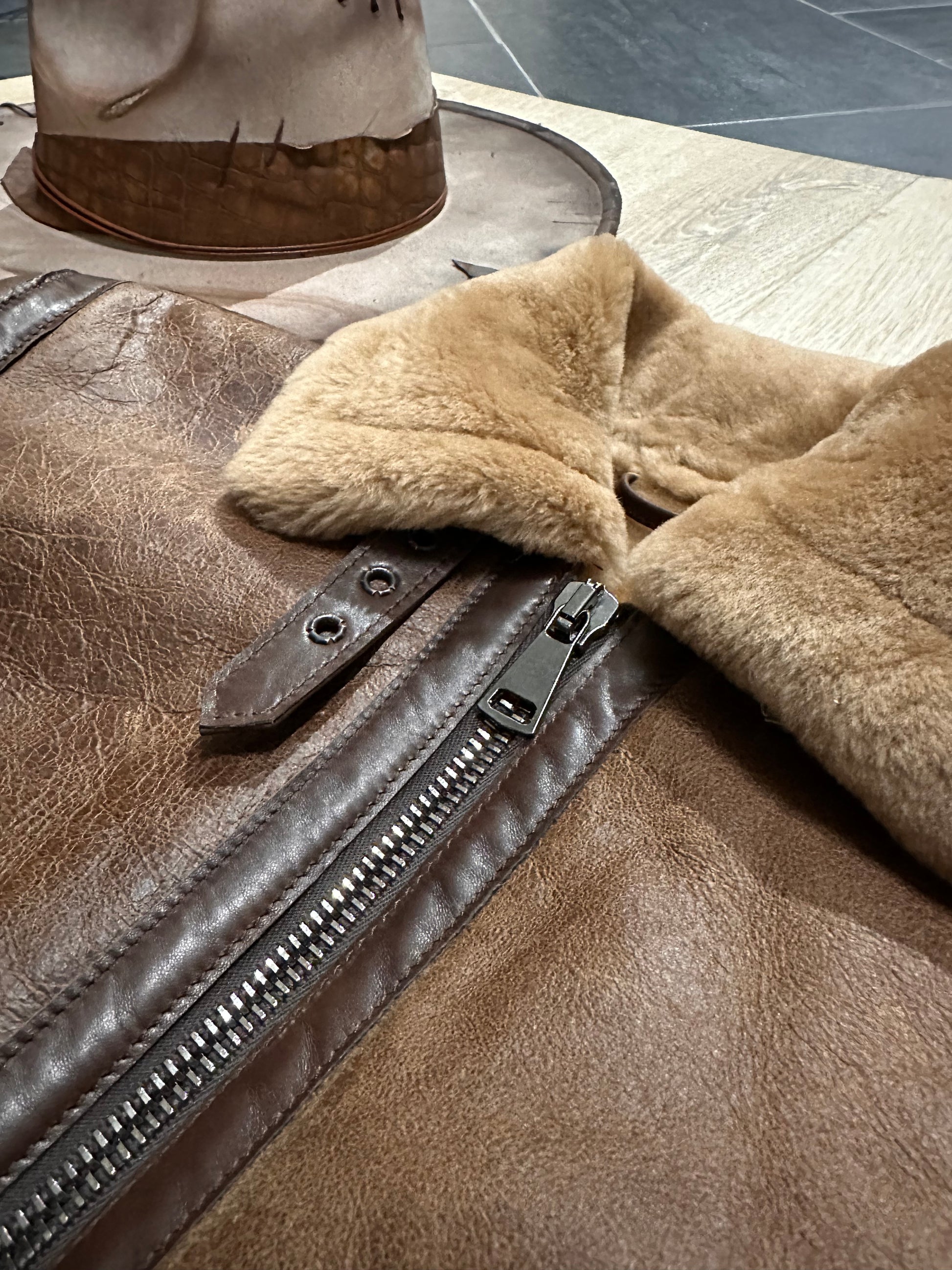 This authentic shearling jacket, crafted from premium sheepskin with a soft natural shearling lining, is inspired by the aviator jackets worn by pilots during World War II. Its silhouette evokes classic military style, with rugged details like the high collar and rolled cuffs, designed to provide extreme warmth in unpressurized cockpits. The vintage brown tones and slightly distressed finish accentuate its retro appeal, making it a tribute to the golden age of aviation.
