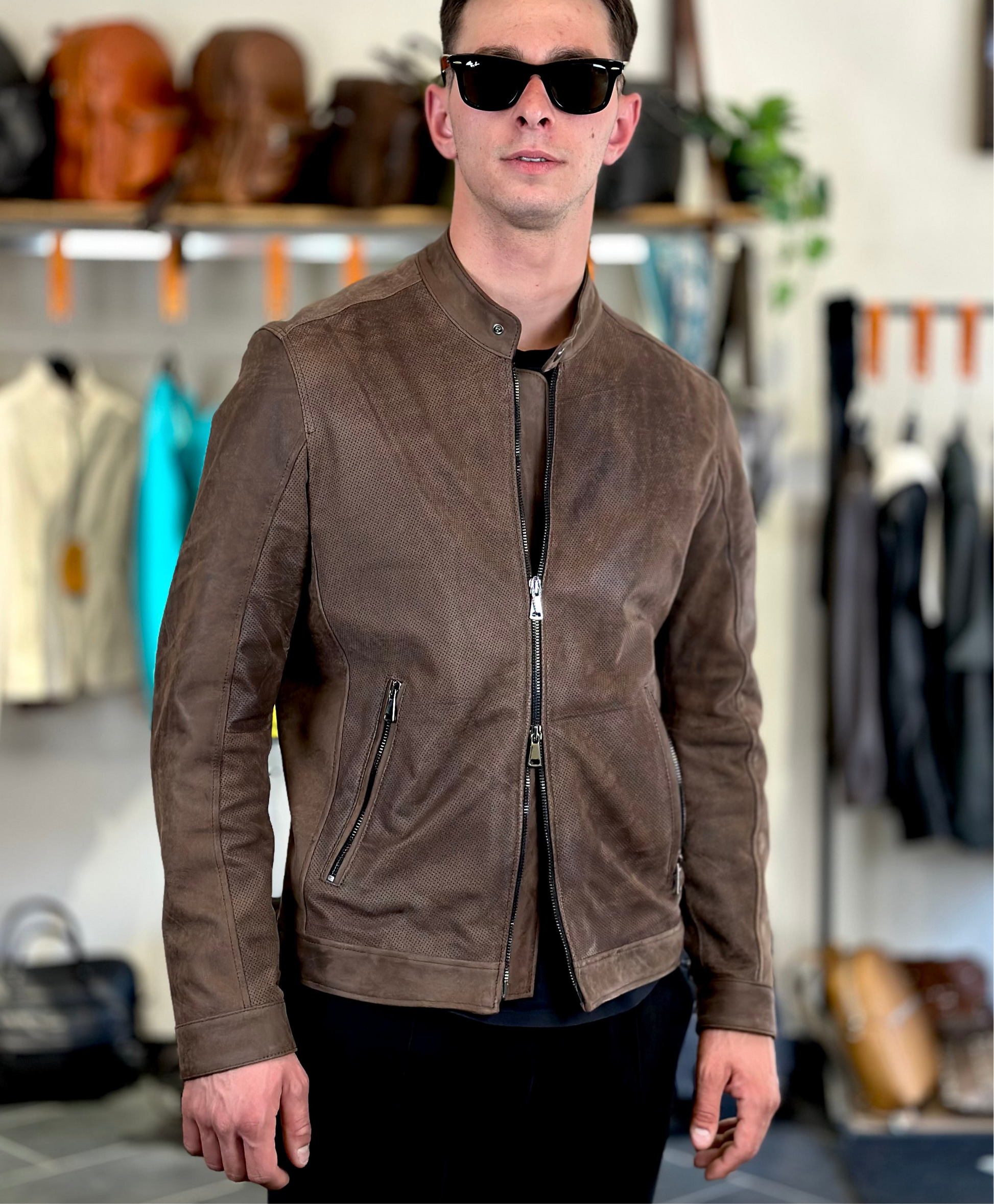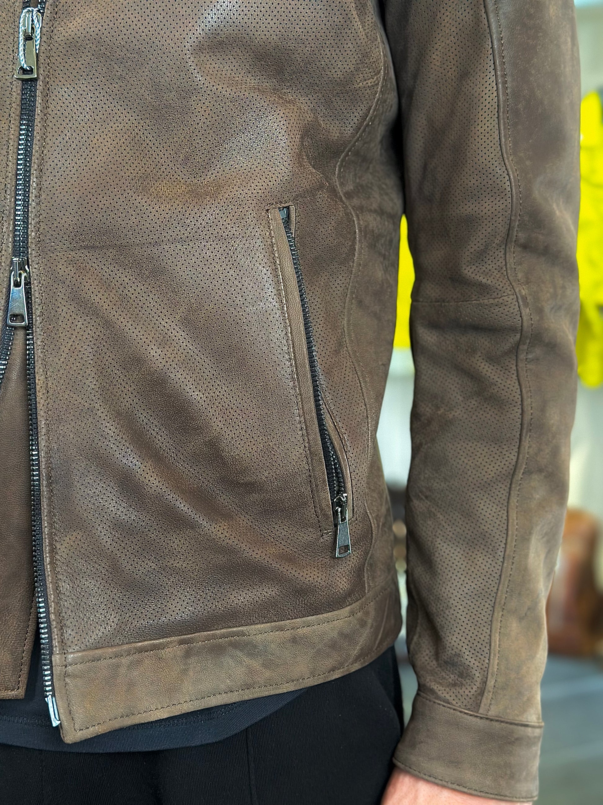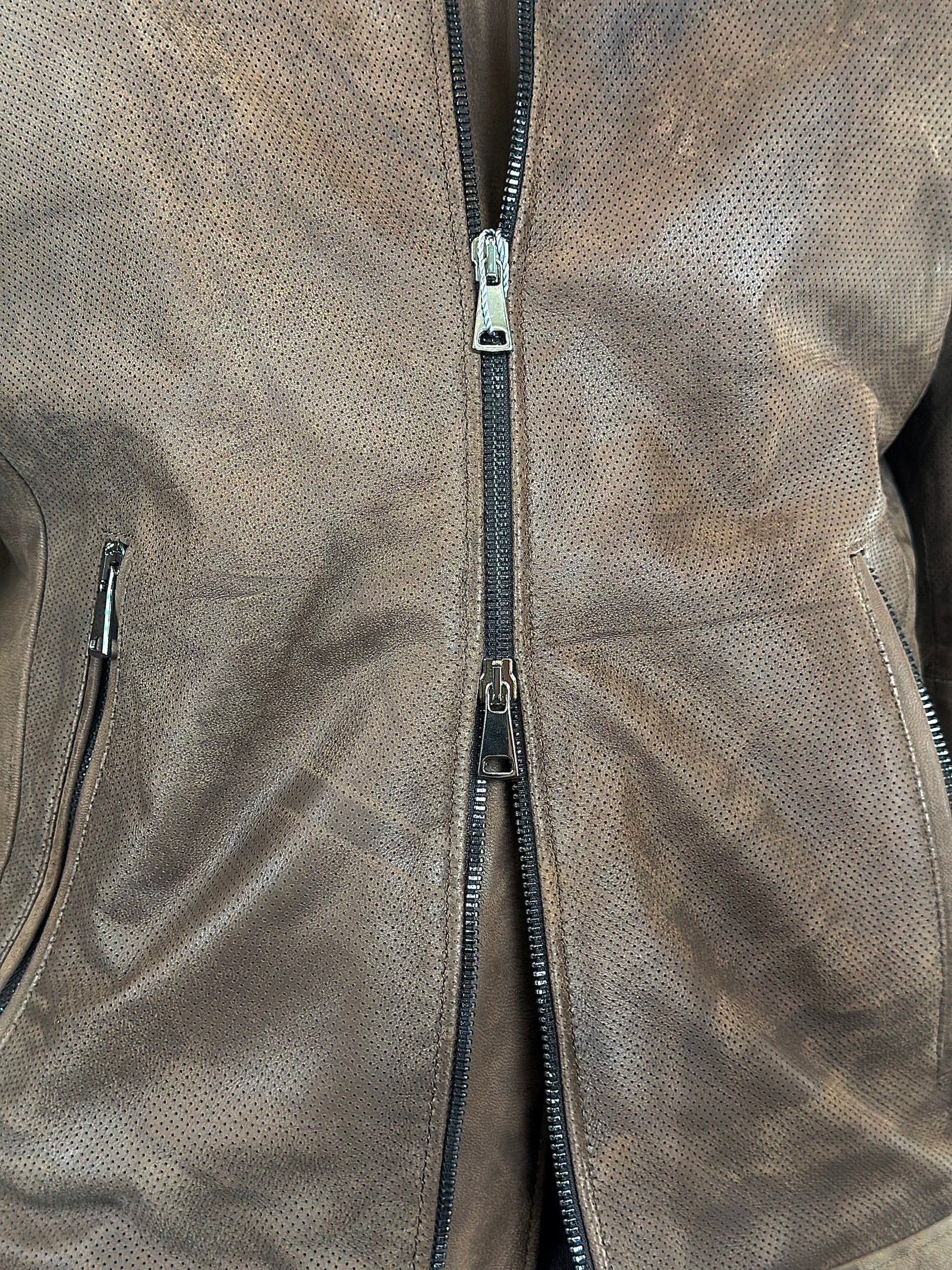 Our Biker Rebel gets a lighter, summerier feel with finely hand-perforated leather, perfect for breathing even on the hottest days, without sacrificing the garment's rugged edge.