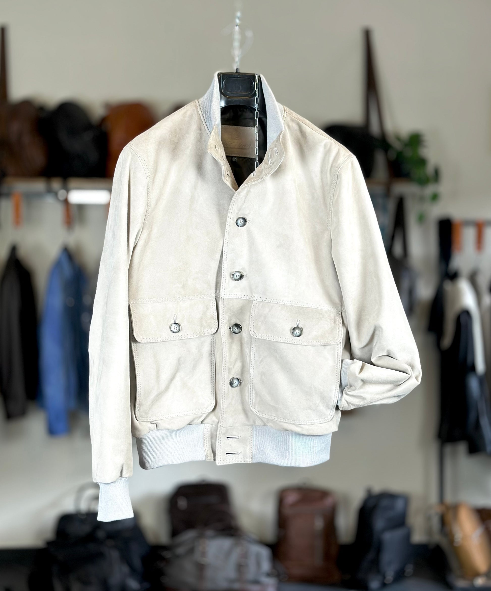 Crafted from soft, ice-colored Italian suede, it features tone-on-tone knit cuffs and hem for a comfortable, structured fit. Every detail is designed to enhance the essential design and the quality of the raw materials.