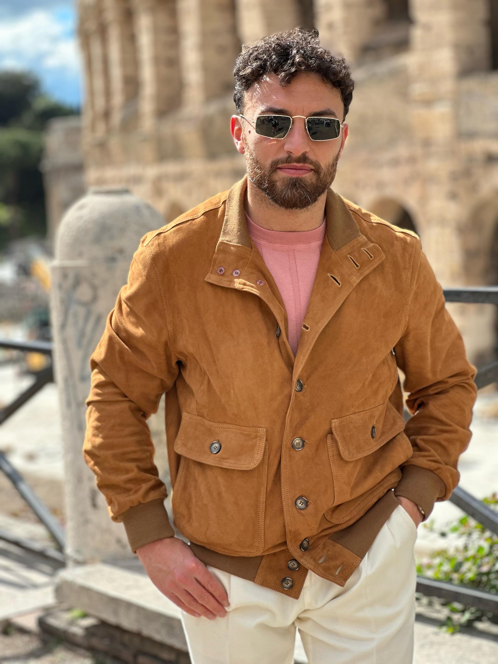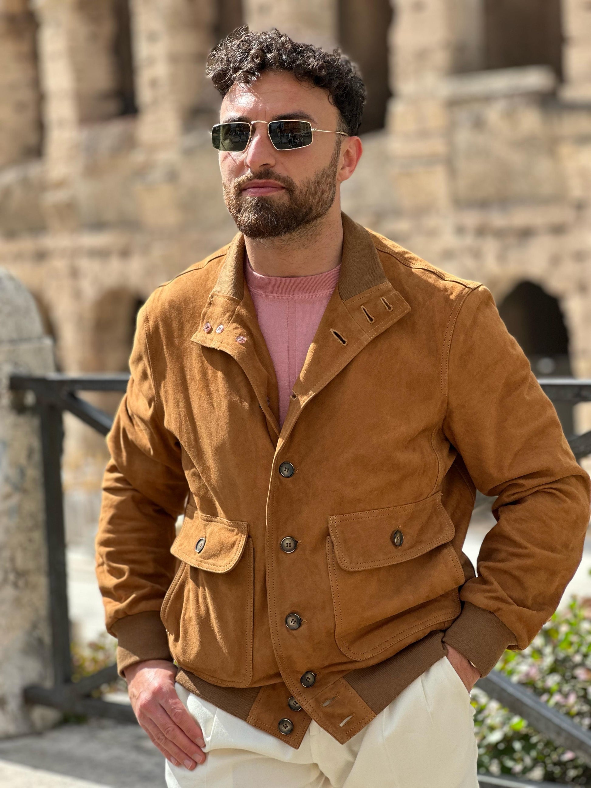 A timeless style icon, the Brera Tasconi model combines character and sophistication in a jacket with a sharp yet extremely versatile fit. Crafted from premium tobacco-colored suede, it stands out for its large front pockets, evoking a workwear aesthetic with a contemporary, urban elegance.