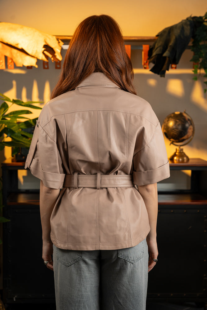The "Wilderness Wanderer Leather Safari Shirt" is a piece of clothing that embodies the spirit of adventure and refinement. Crafted from high-quality leather, this shirt combines the elegance of leather with the practical and functional style of safari. Design details, such as patch pockets and snap buttons, recall the classic aesthetic of wilderness exploration. This shirt exudes a sense of adventure and timeless style, perfect for exploring nature or adding a touch of wild elegance to your everyday life.