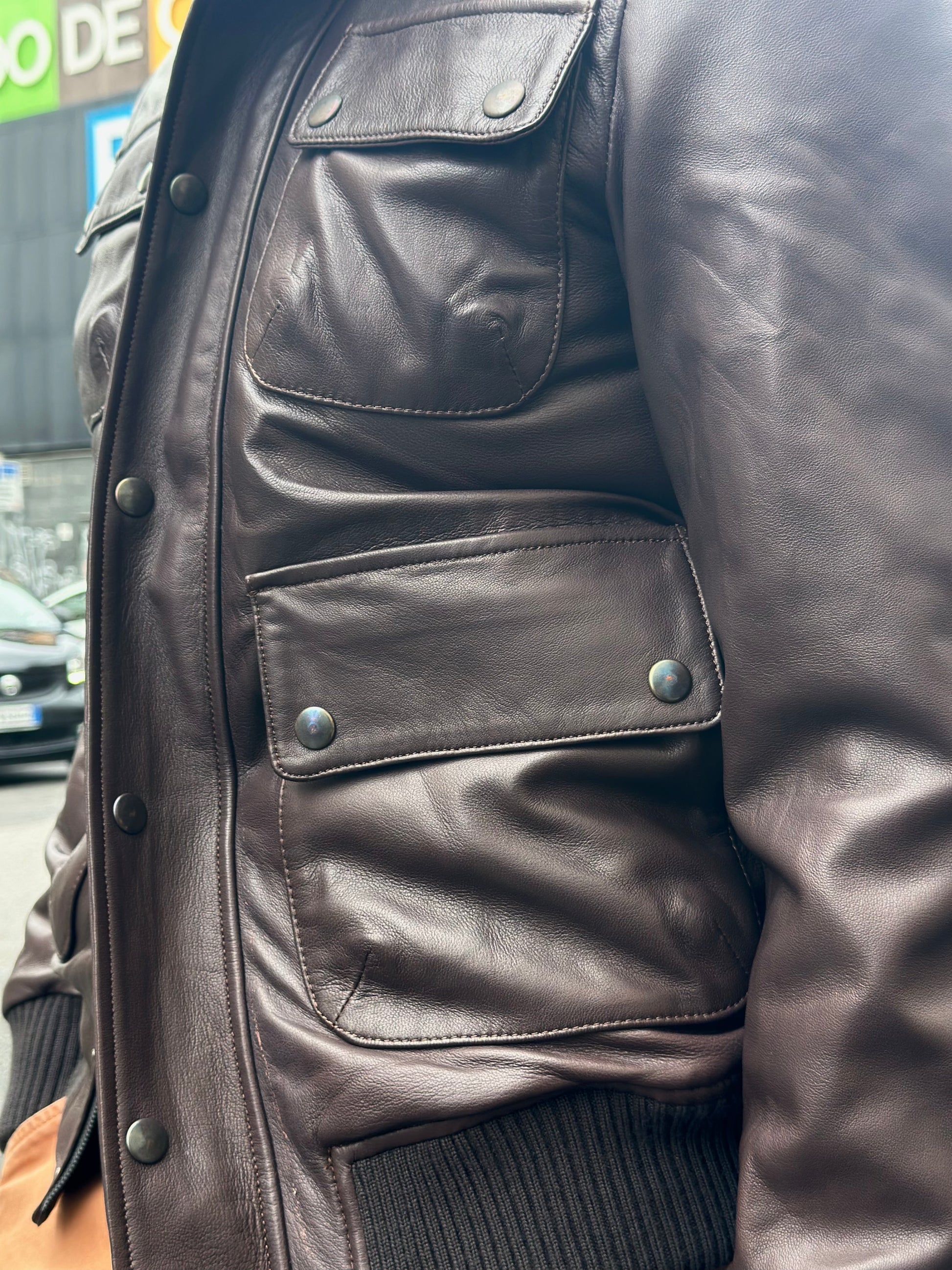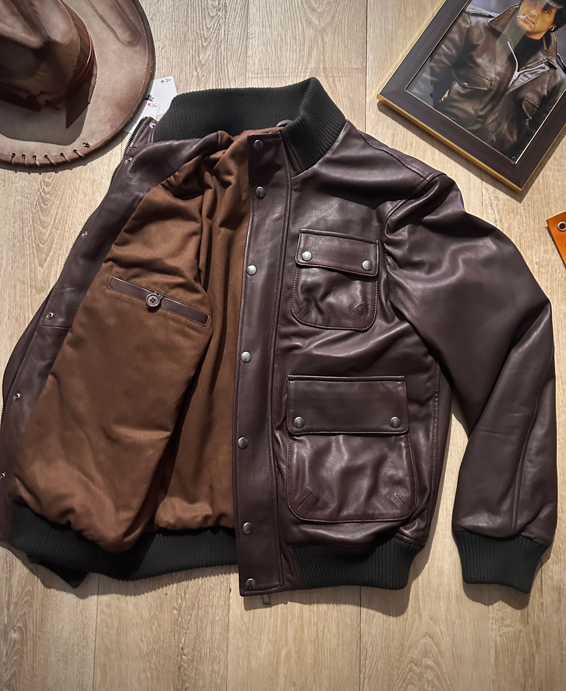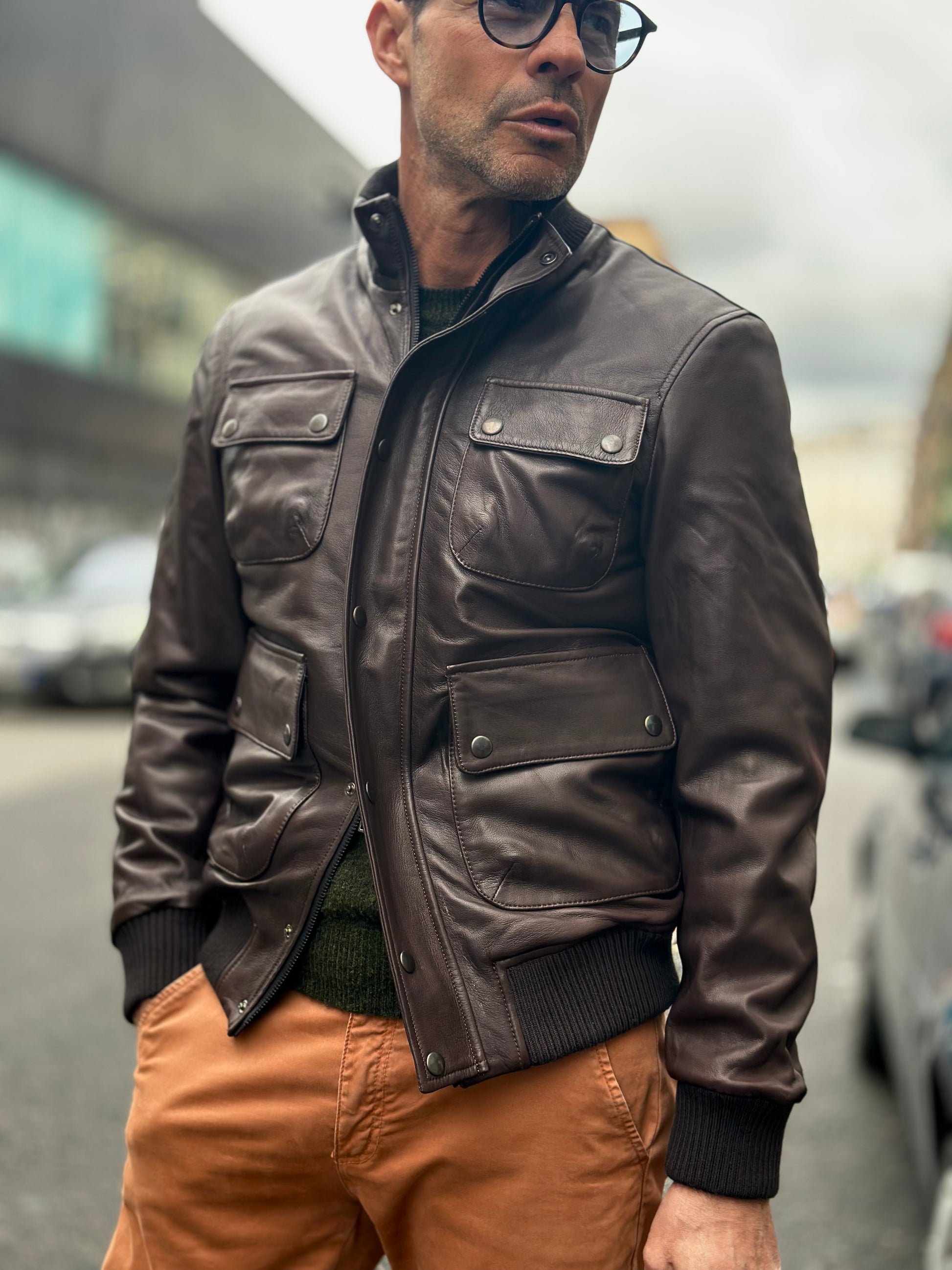 The Dakota Jacket is a timeless piece crafted from premium dark brown natural nappa leather, selected for its softness and durability. The rugged yet refined design is enhanced by functional details such as the four front pockets with flaps and snap buttons, perfect for everyday wear and adding character to any look.