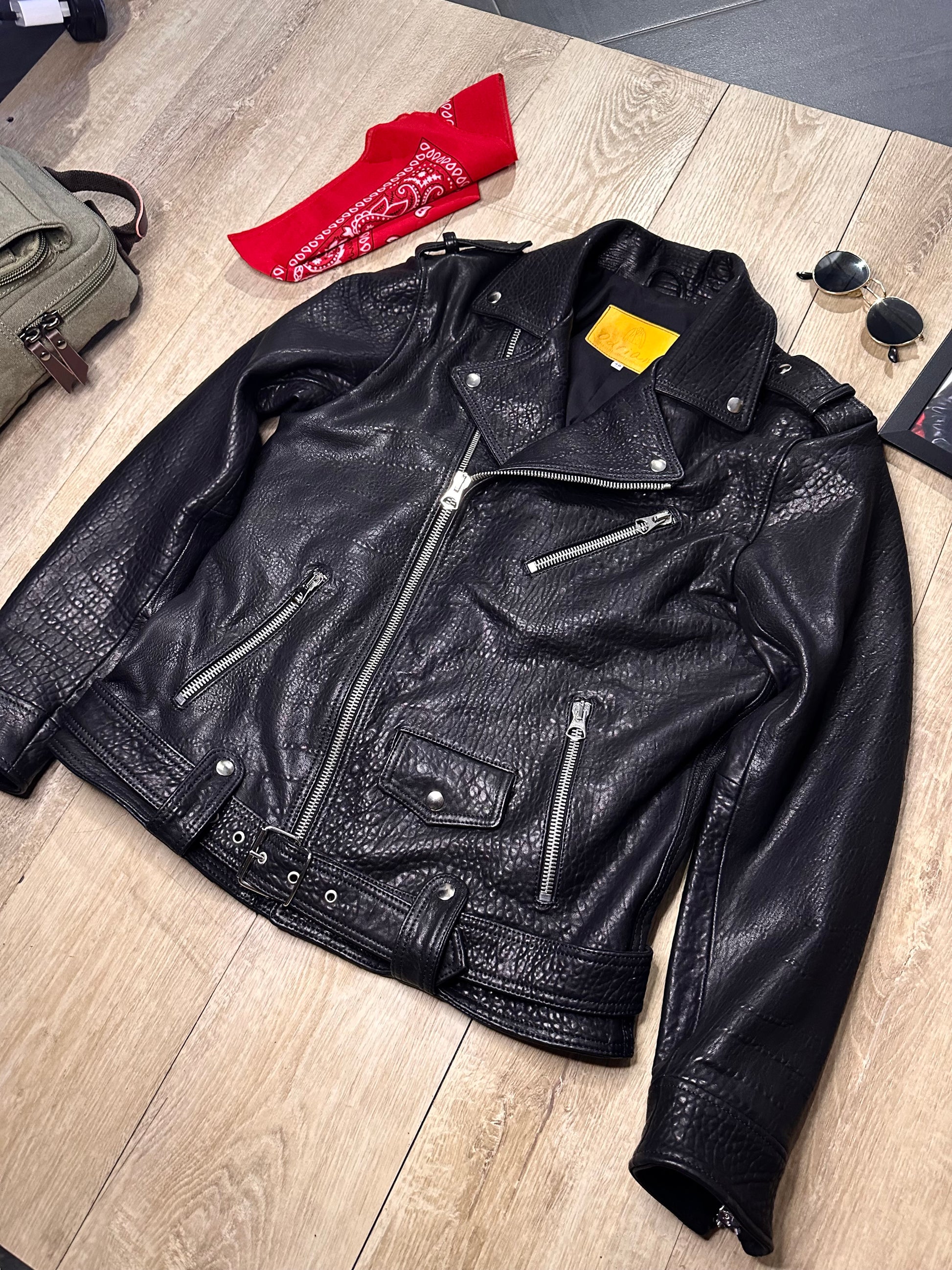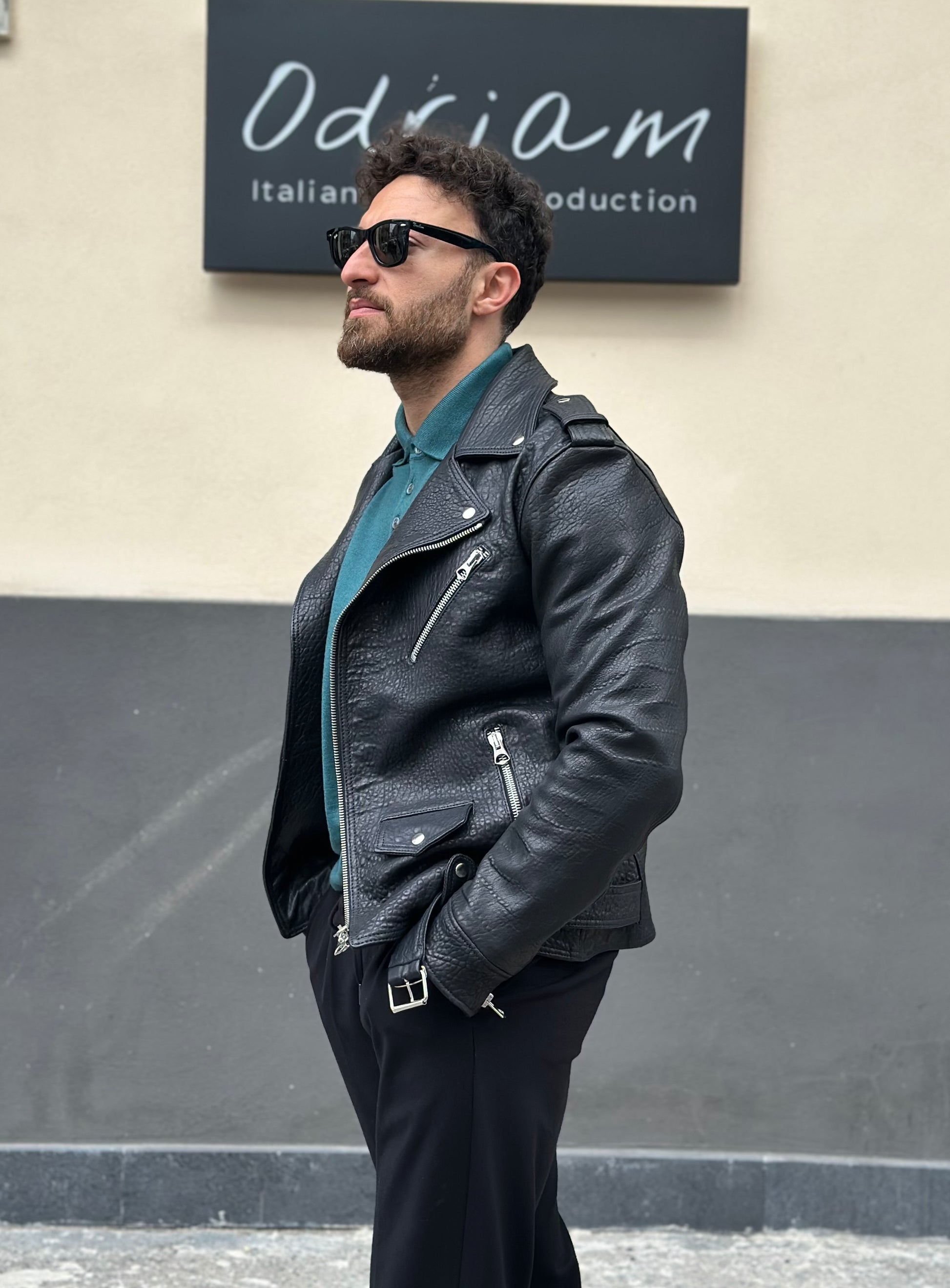 A biker jacket with a bold personality, crafted from premium New Zealand lambskin with a textured grain, giving the jacket a bold and distinctive look. Every detail is designed to ensure quality and authenticity: an exposed Italian chain-8 zipper, snap-button shoulders, and a tailored fit that enhances the garment's structure.
