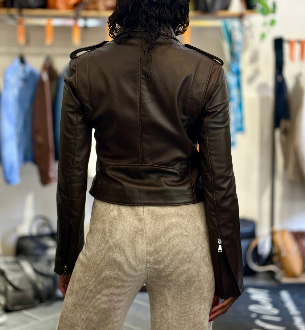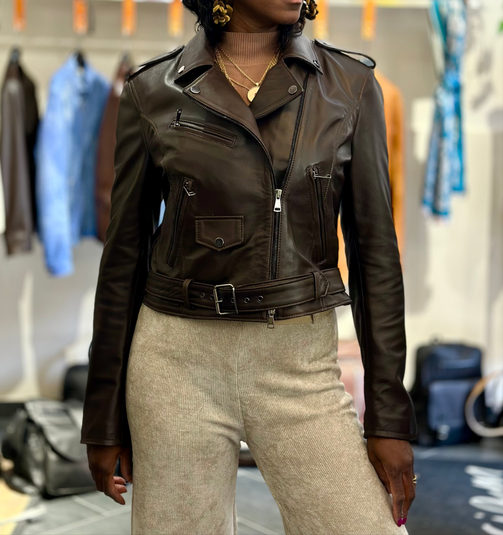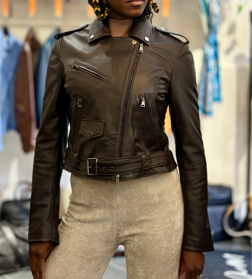 Feminine, decisive, indomitable. The Pantera is a smooth nappa leather jacket that exudes strength and sensuality in every detail. The dark brown color enhances the leather's sophistication, lending depth and warmth to a silhouette that blends biker tradition with tailored fit.