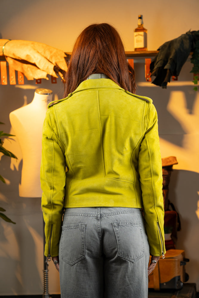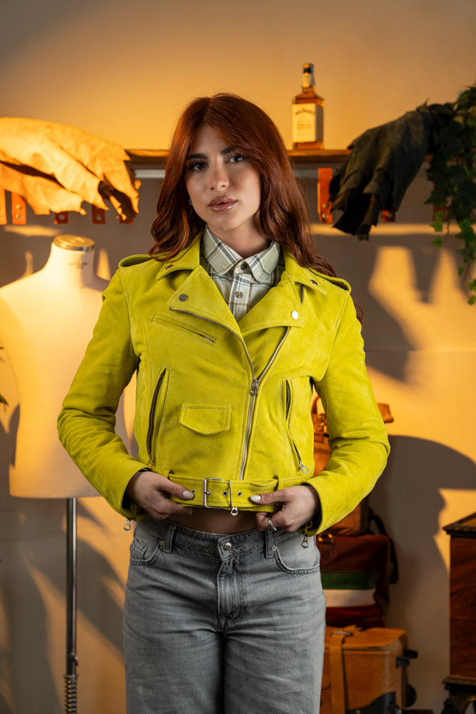 The "Pantera" jacket is a perfect piece for spring that embodies the energy and freshness of the season. Crafted from soft lime yellow suede, this biker jacket adds a vibrant and bright touch to your wardrobe. Its vibrant hue evokes images of sunny short trips and bright spring days. The classic moto jacket design, with its clean lines and fitted silhouette, offers a modern and fashionable look. The quality craftsmanship and high-quality finishes lend a sophisticated and refined look. When worn, this biker jacket captures the eye with its liveliness and contemporary appeal, making it an essential addition to the wardrobe of those seeking a garment that stands out for its style and personality. Perfect for spring, this biker jacket will make you feel fresh, fashionable, and full of energy no matter the occasion.