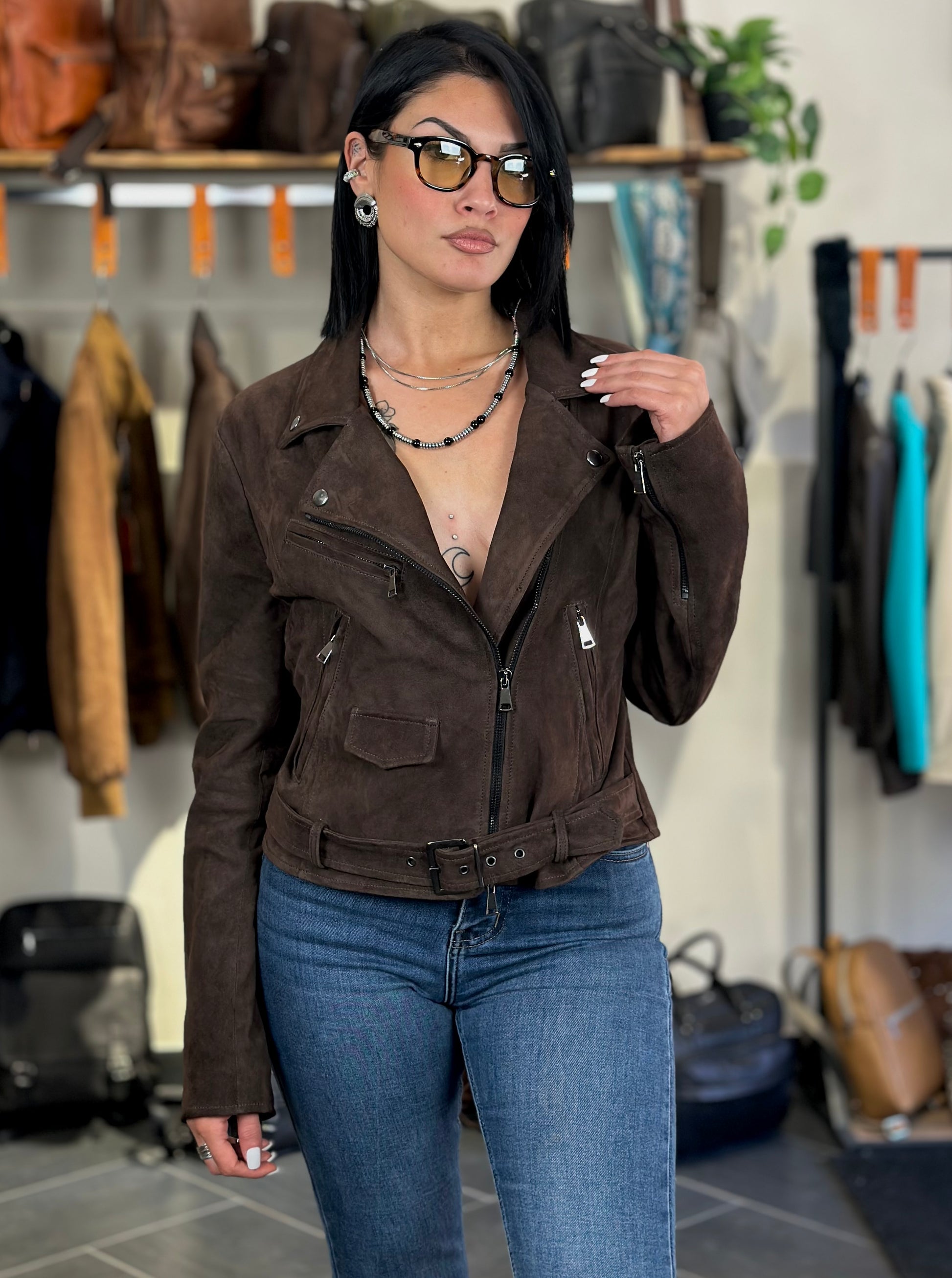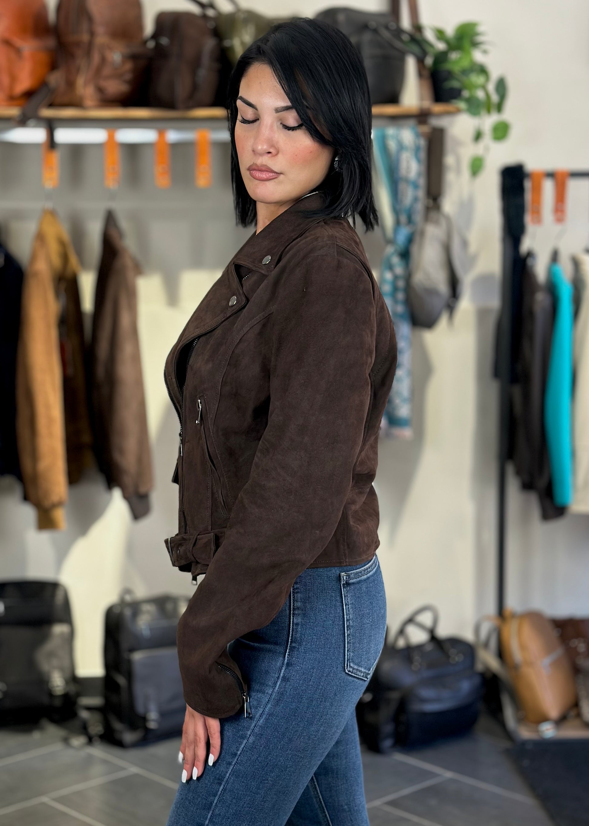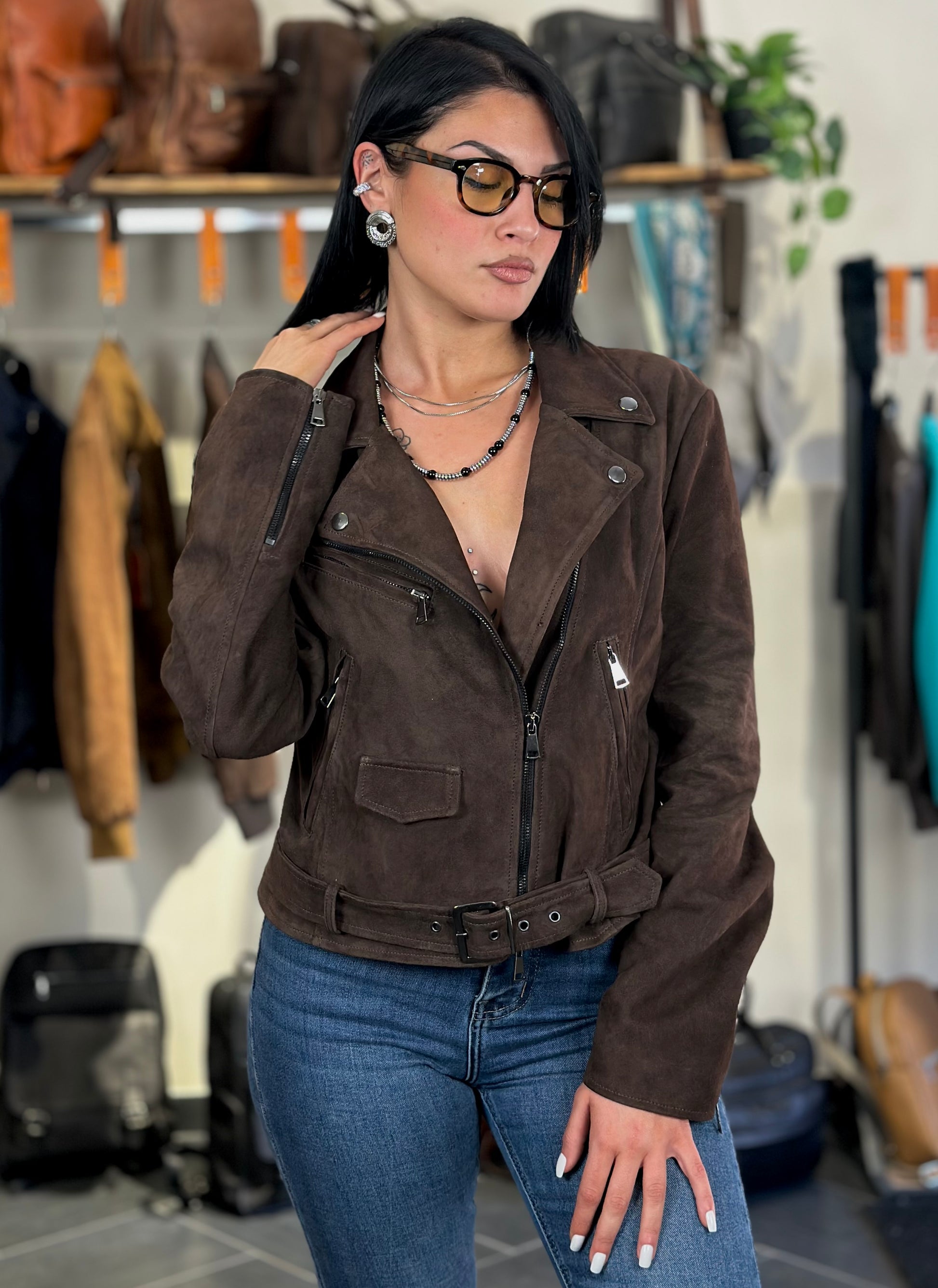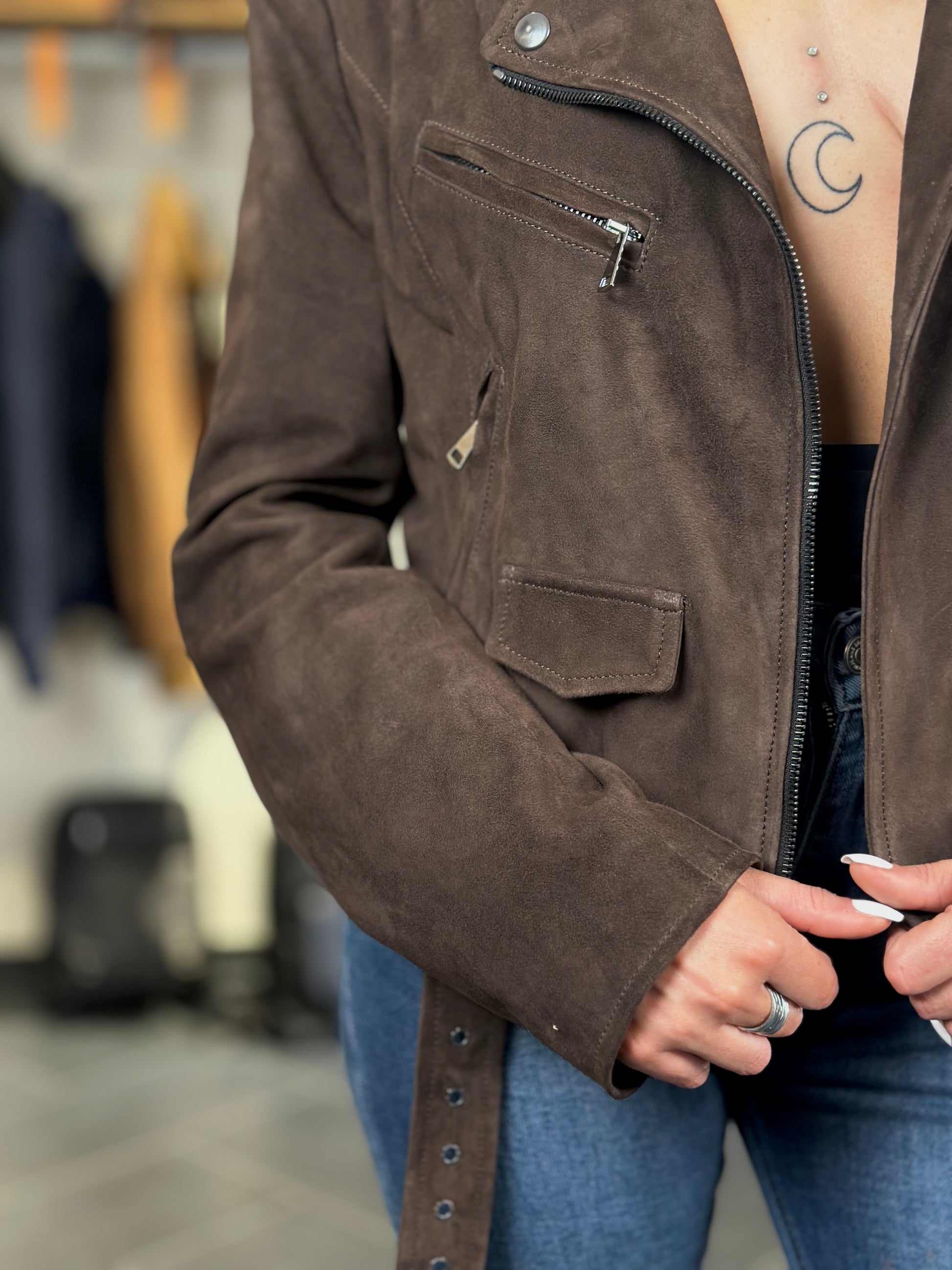 Crafted from premium Italian suede, this jacket stands out for its velvety texture and deep, warm, and enveloping dark brown hue. The gunmetal-finish hardware and zippers complement the garment's color perfectly, adding a modern, refined touch without overly dramatic color contrasts.