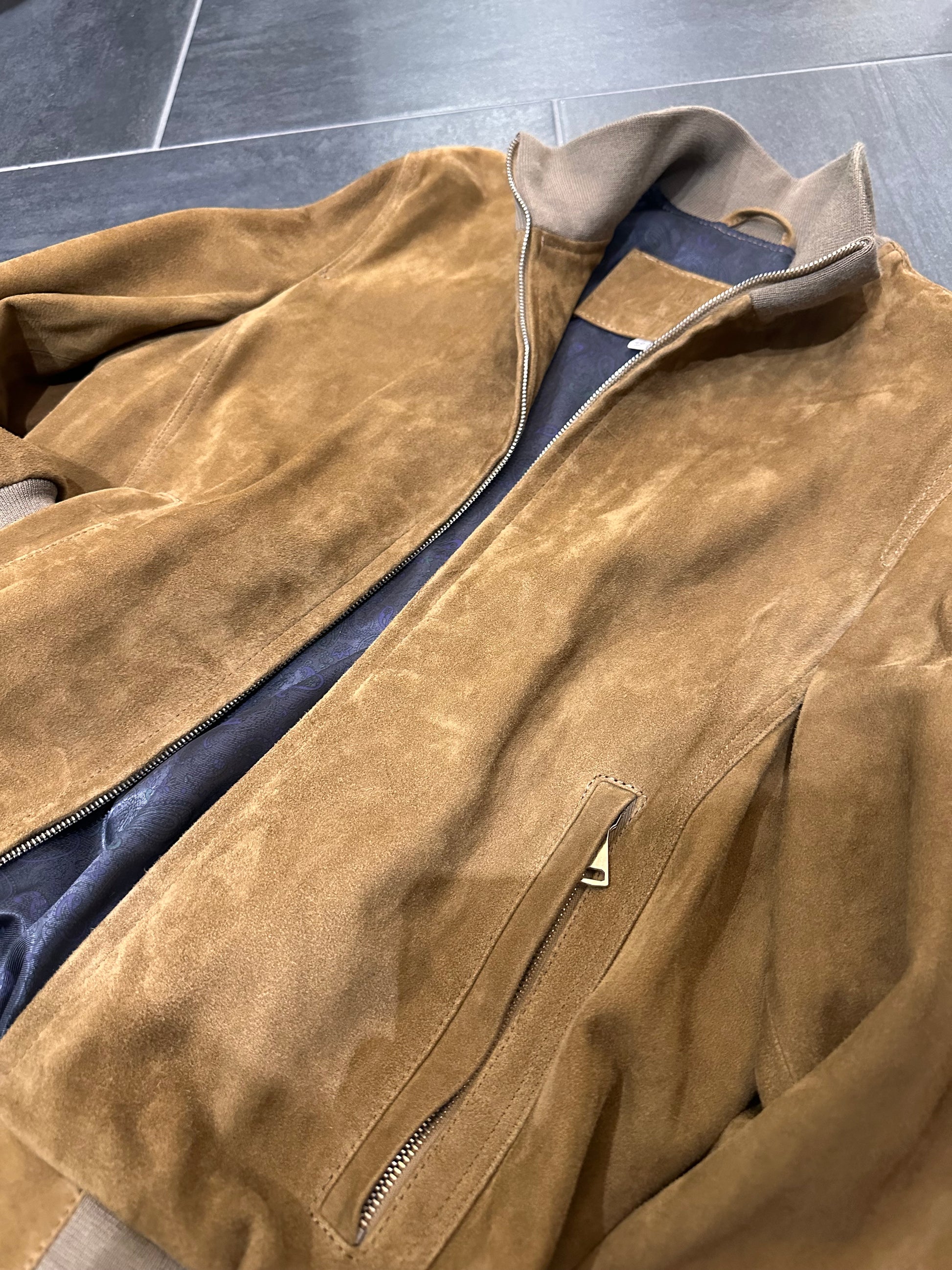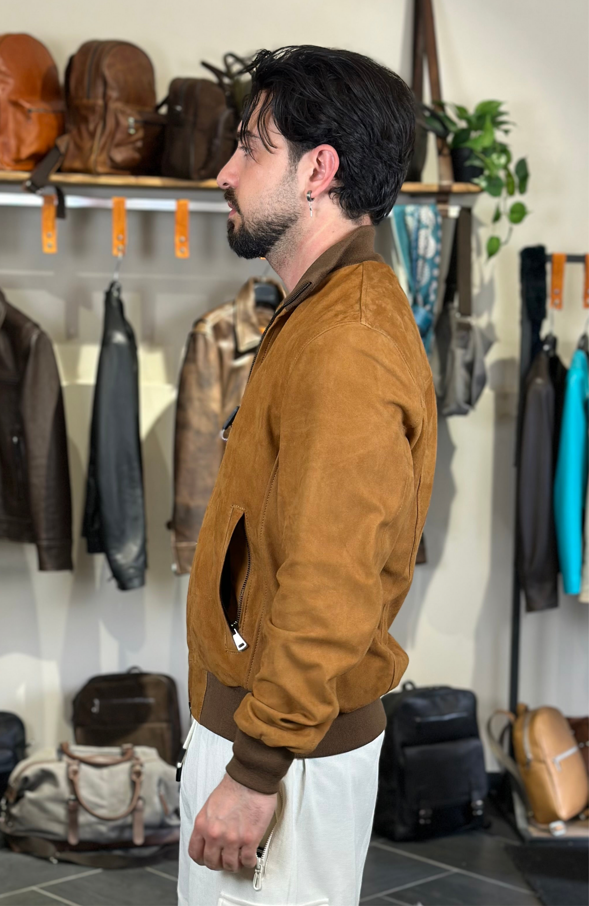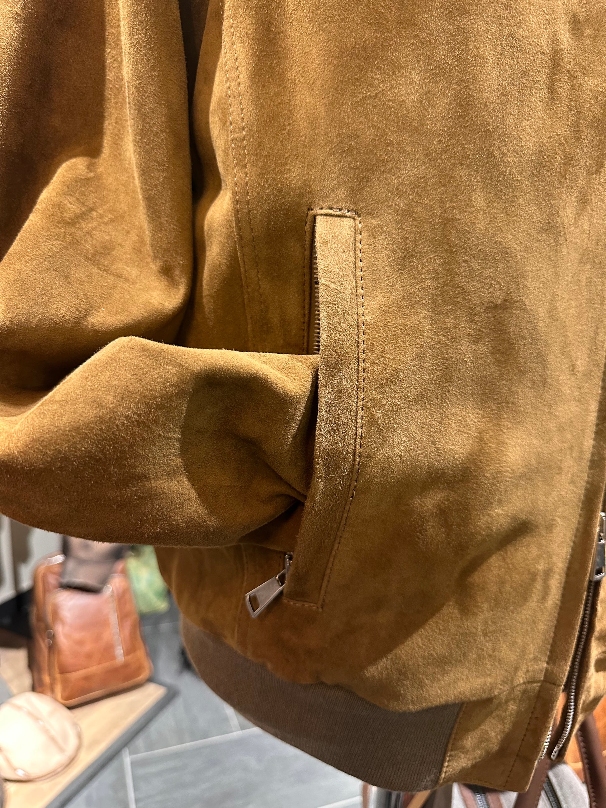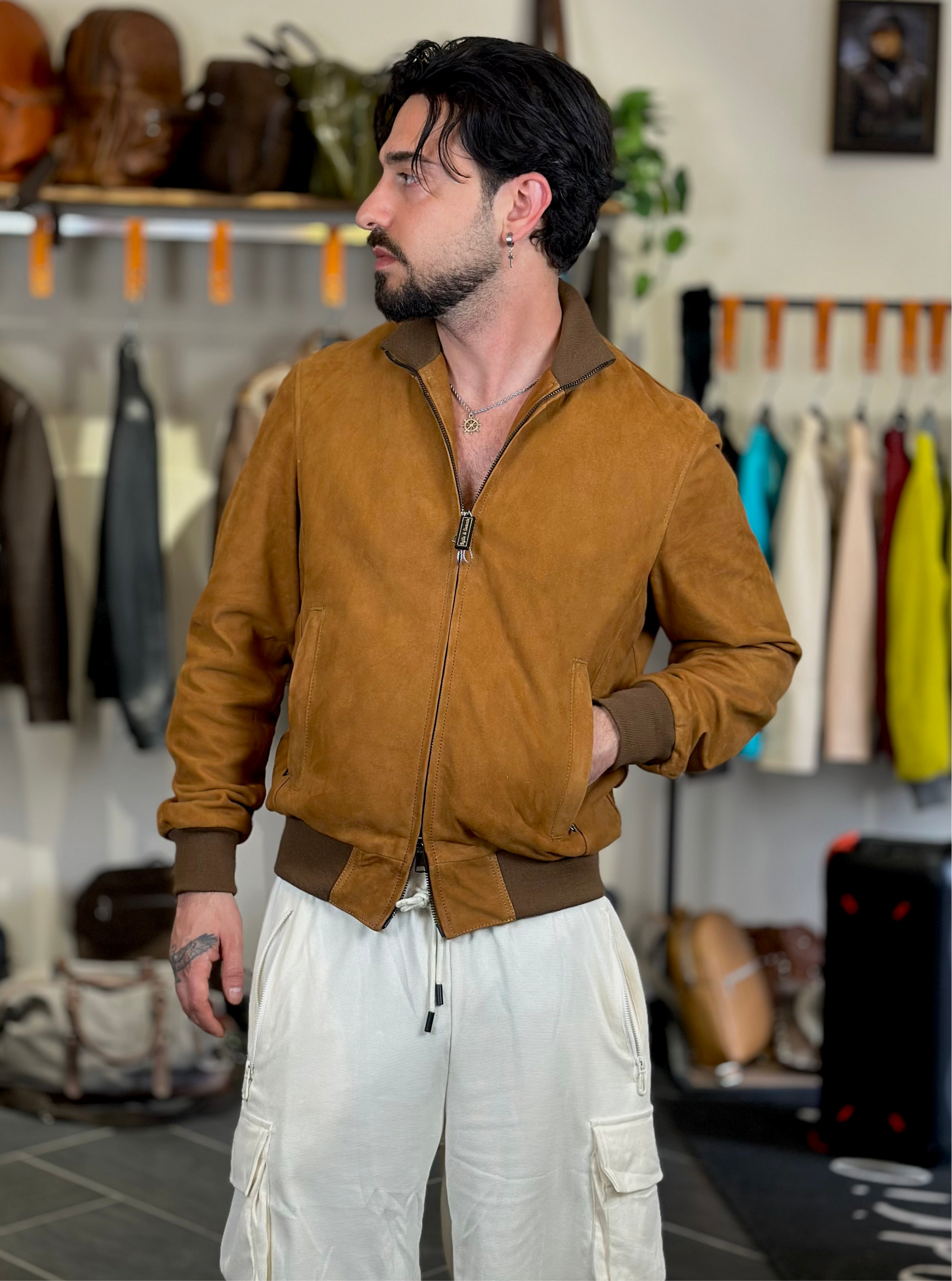This high-quality suede bomber jacket comes in an elegant camel color that lends it a sophisticated and versatile look. The secure center zip closure ensures a comfortable and functional fit, while the side zip pockets offer practicality without sacrificing style. The ribbed collar, cuffs, and waistband add a classic touch and a snug fit, providing elegant protection from the cold. This suede bomber jacket is a timeless piece, perfect for completing any look with a blend of comfort and sophistication.