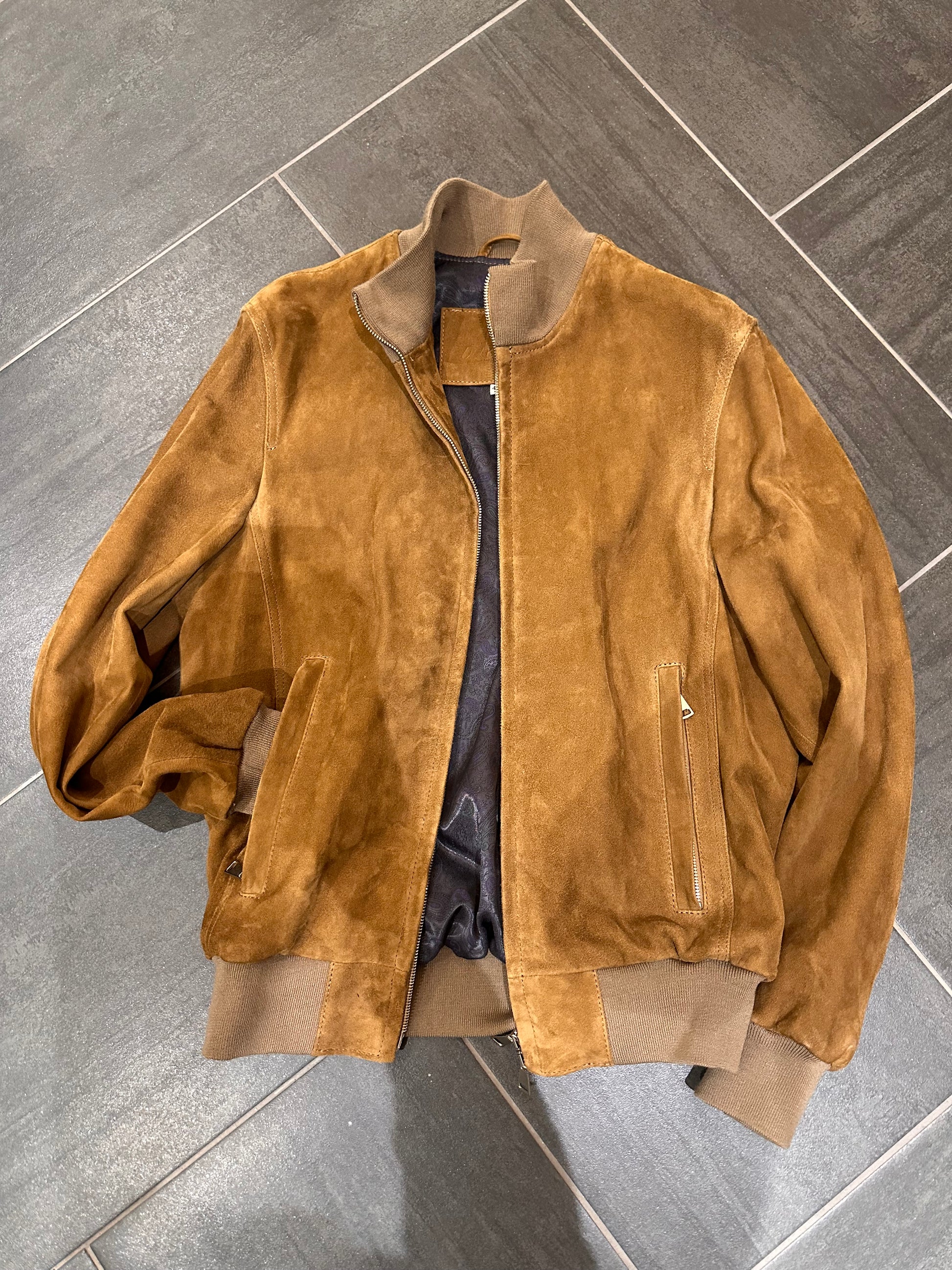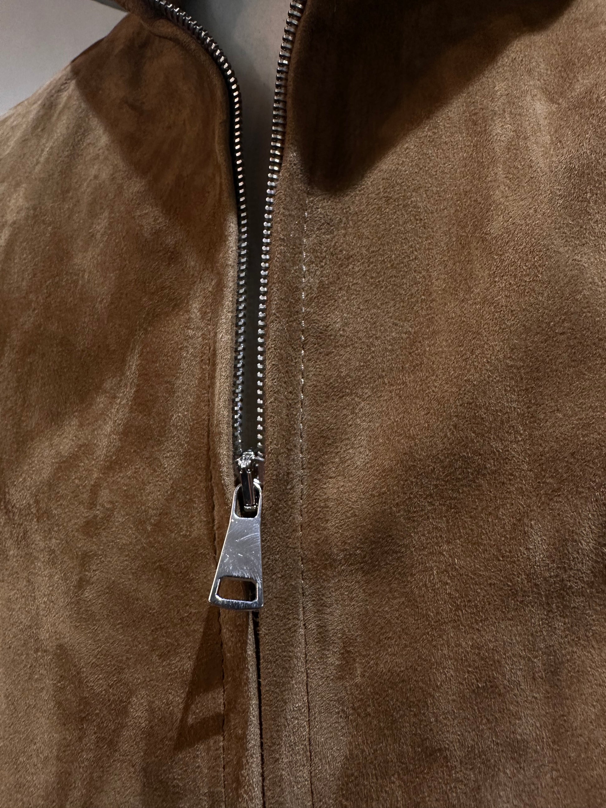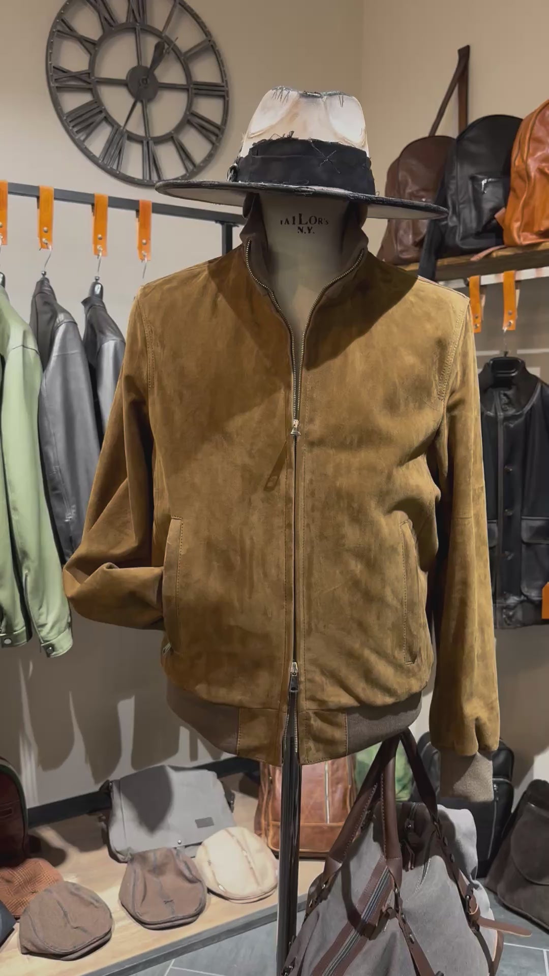 This high-quality suede bomber jacket comes in an elegant camel color that lends it a sophisticated and versatile look. The secure center zip closure ensures a comfortable and functional fit, while the side zip pockets offer practicality without sacrificing style. The ribbed collar, cuffs, and waistband add a classic touch and a snug fit, providing elegant protection from the cold. This suede bomber jacket is a timeless piece, perfect for completing any look with a blend of comfort and sophistication.