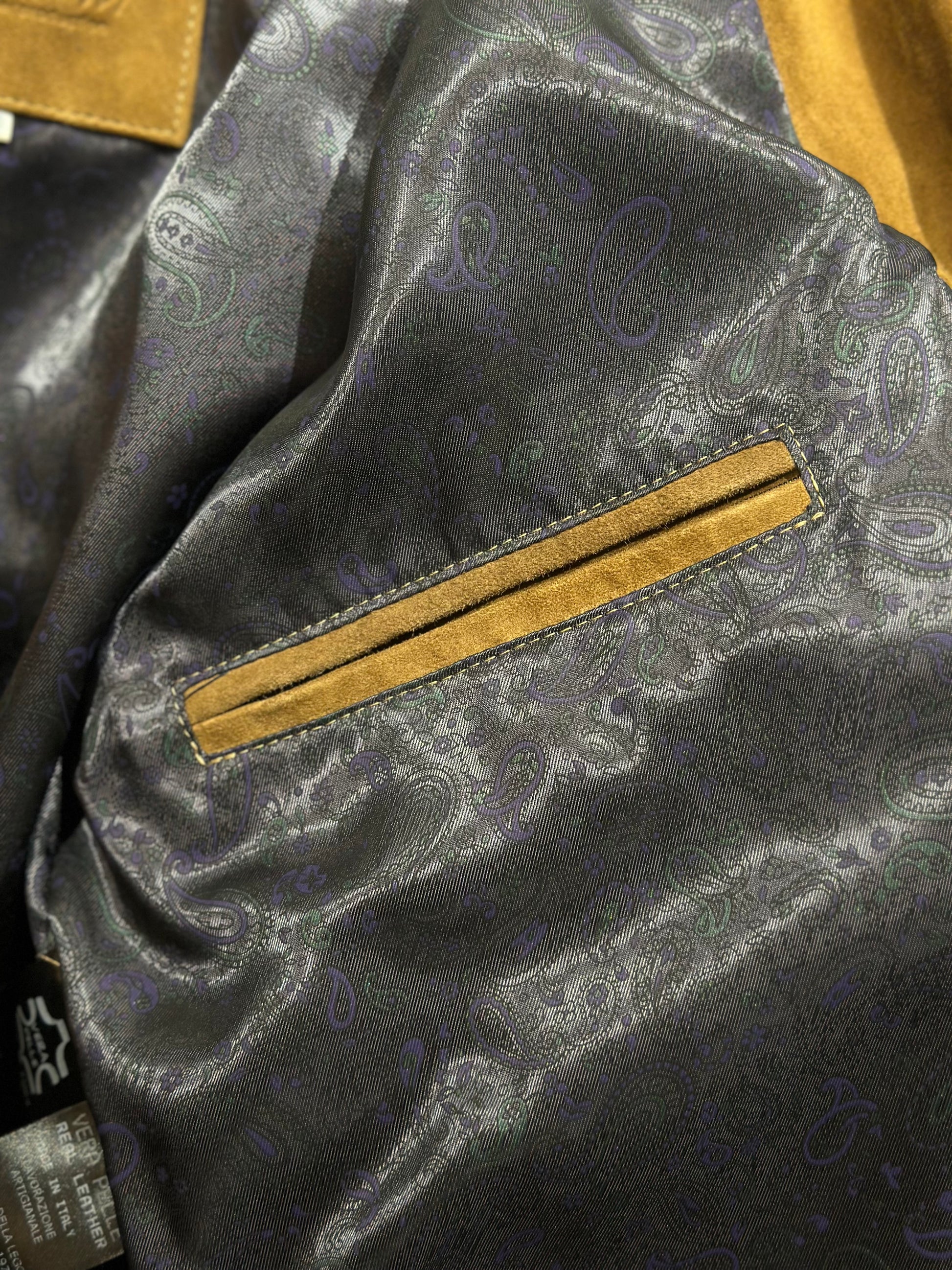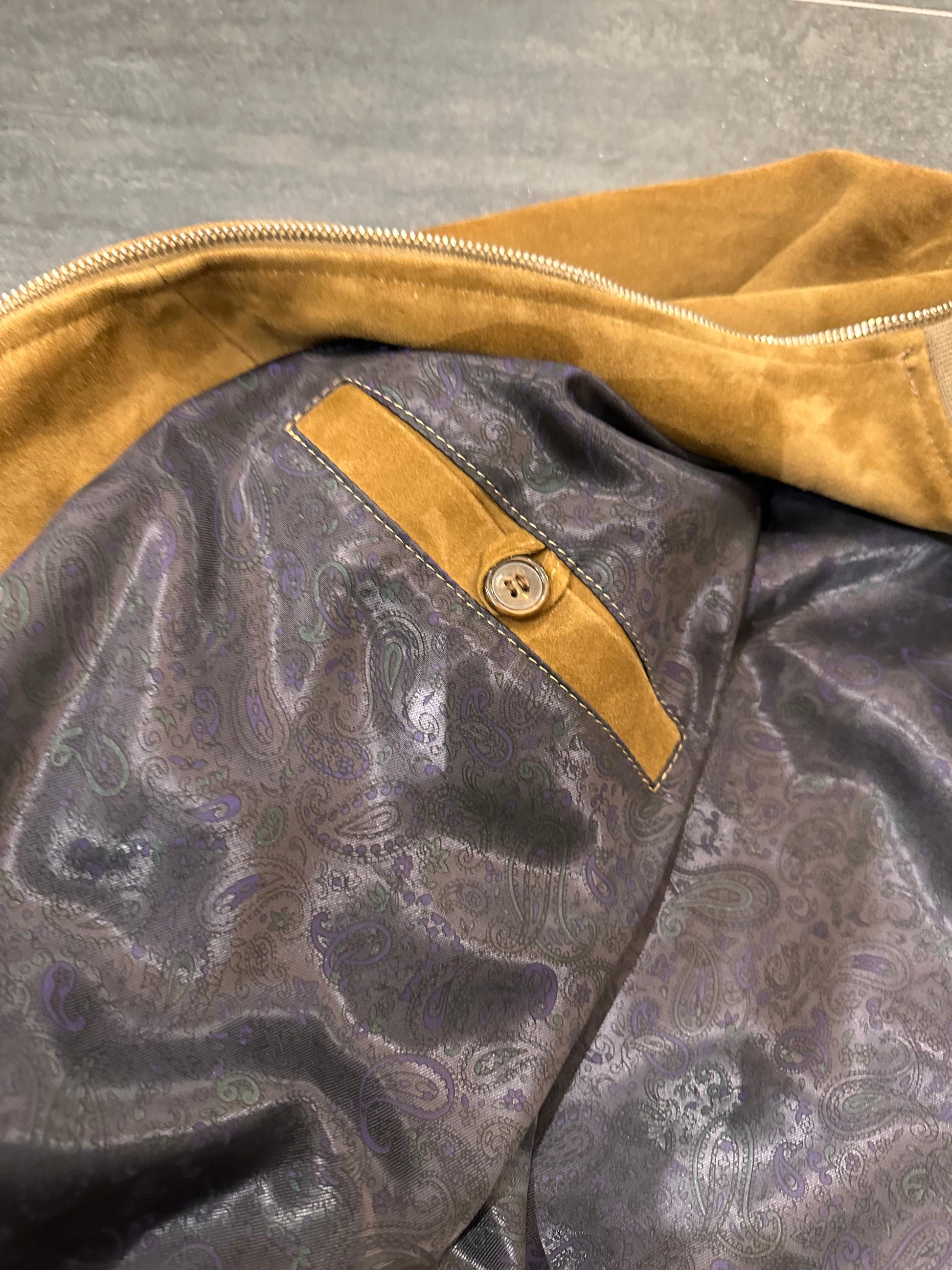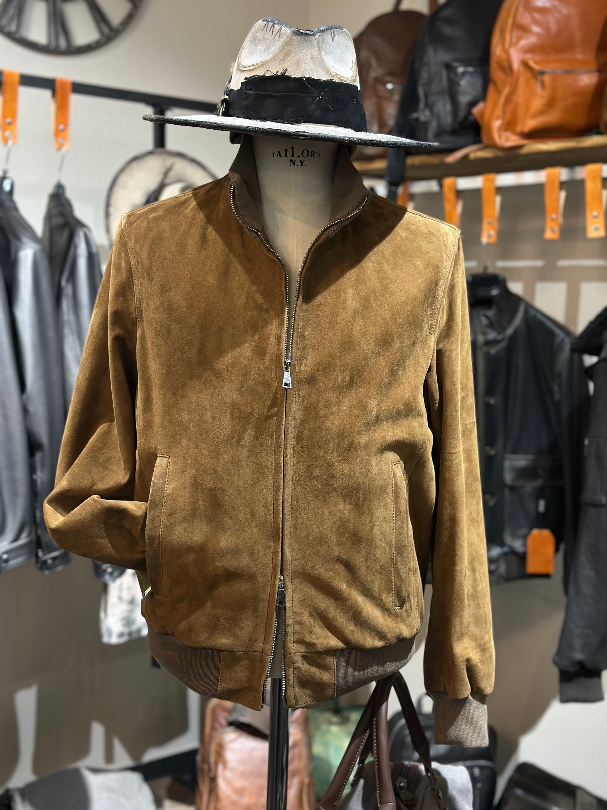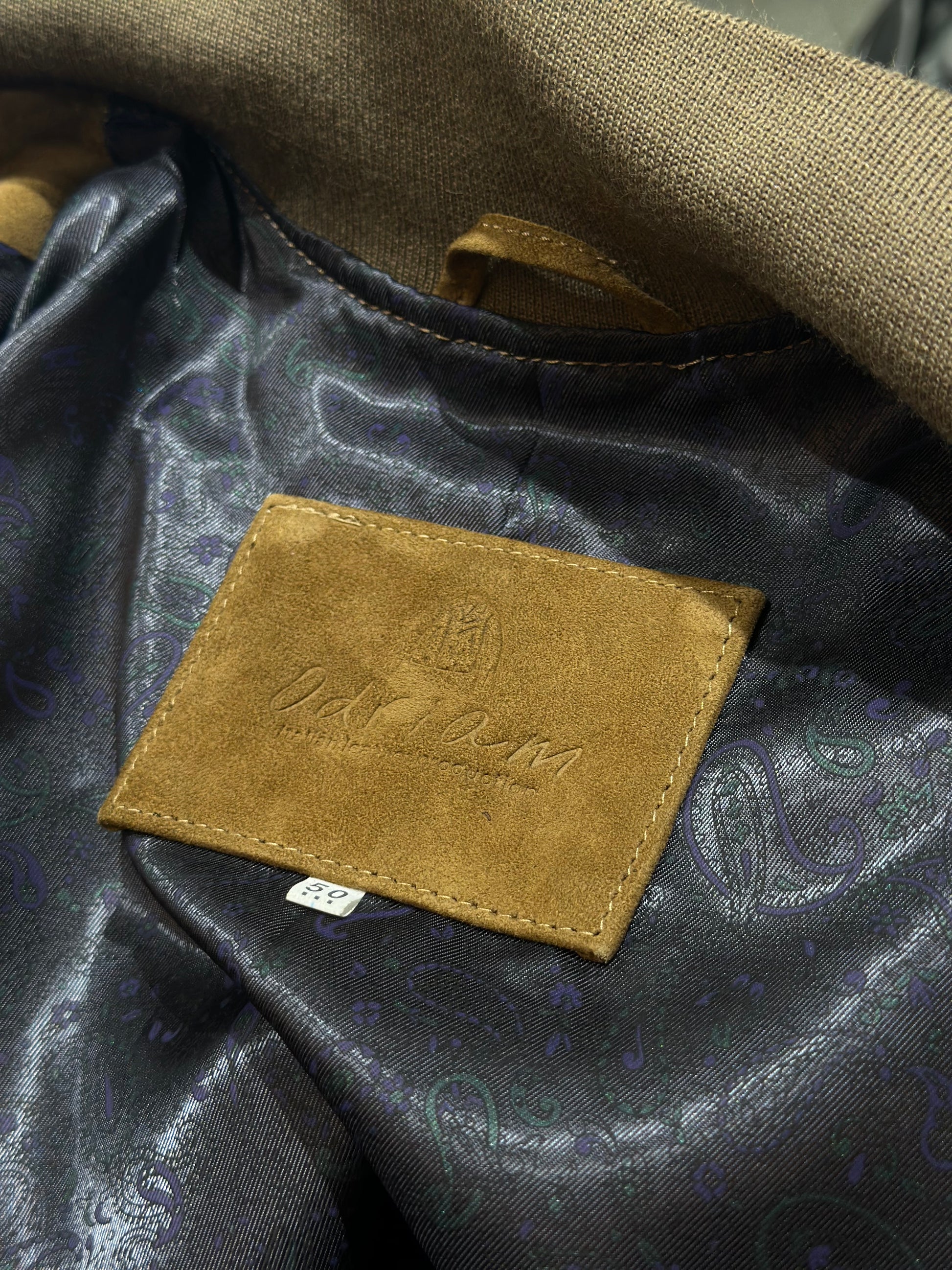 This high-quality suede bomber jacket comes in an elegant camel color that lends it a sophisticated and versatile look. The secure center zip closure ensures a comfortable and functional fit, while the side zip pockets offer practicality without sacrificing style. The ribbed collar, cuffs, and waistband add a classic touch and a snug fit, providing elegant protection from the cold. This suede bomber jacket is a timeless piece, perfect for completing any look with a blend of comfort and sophistication.