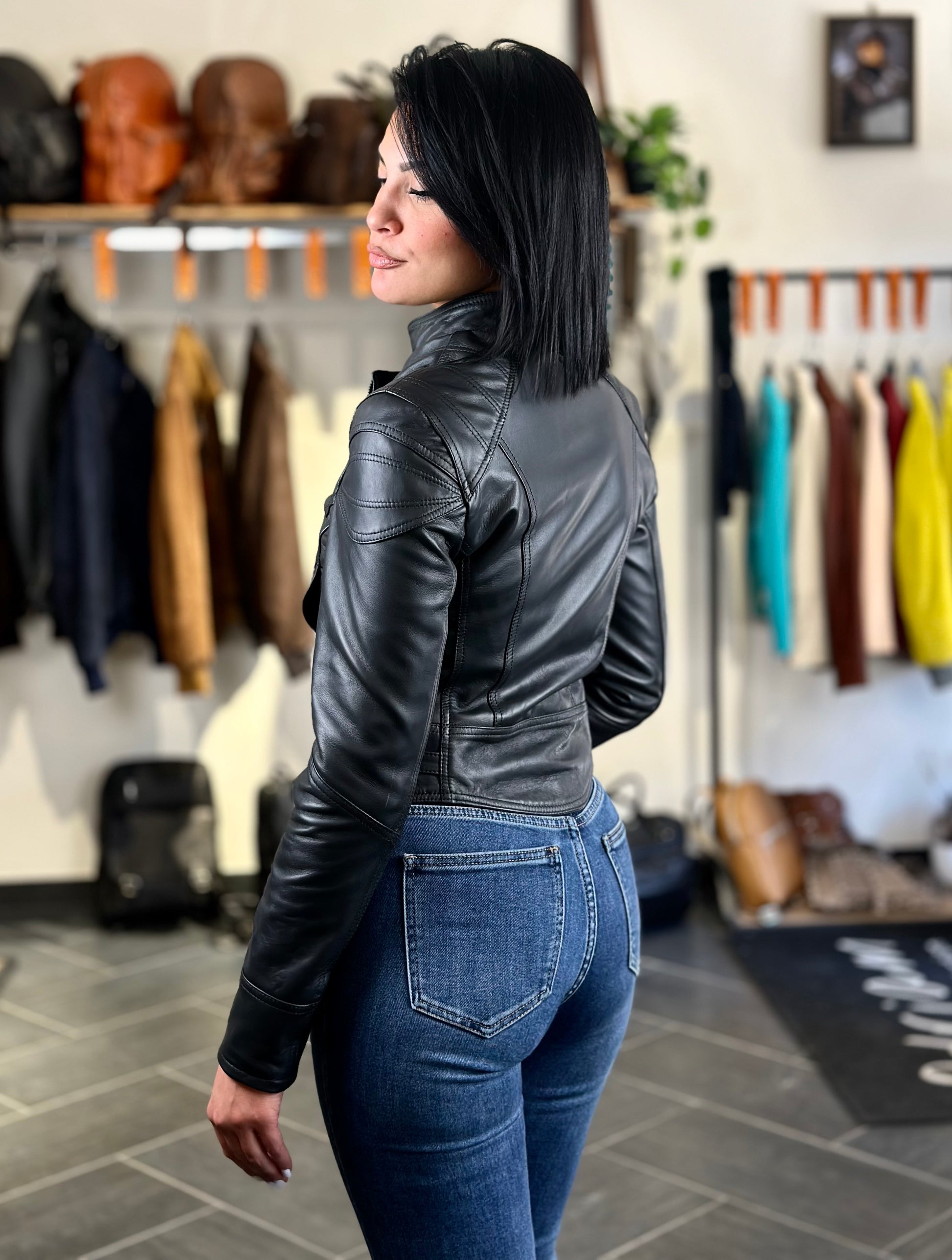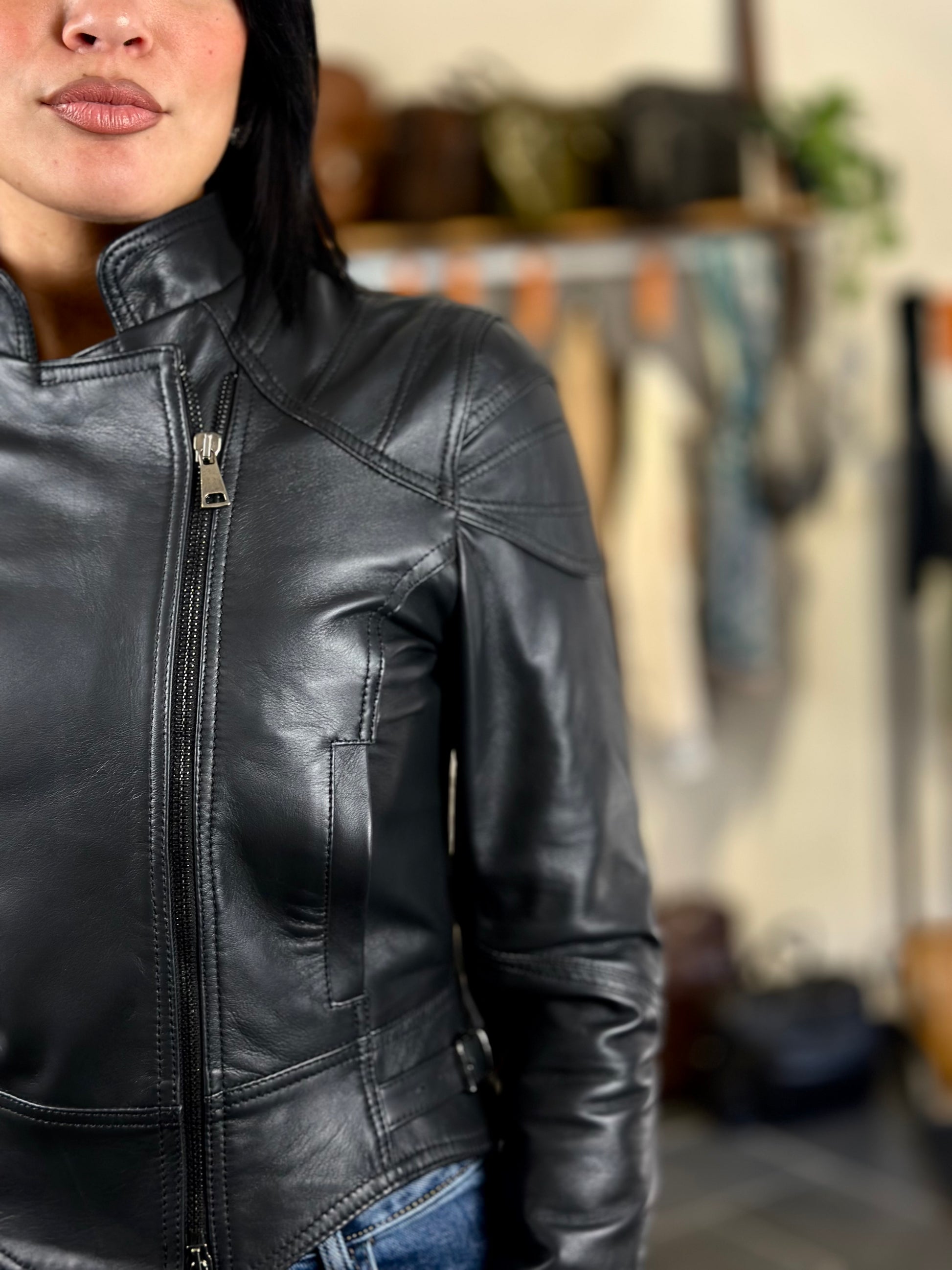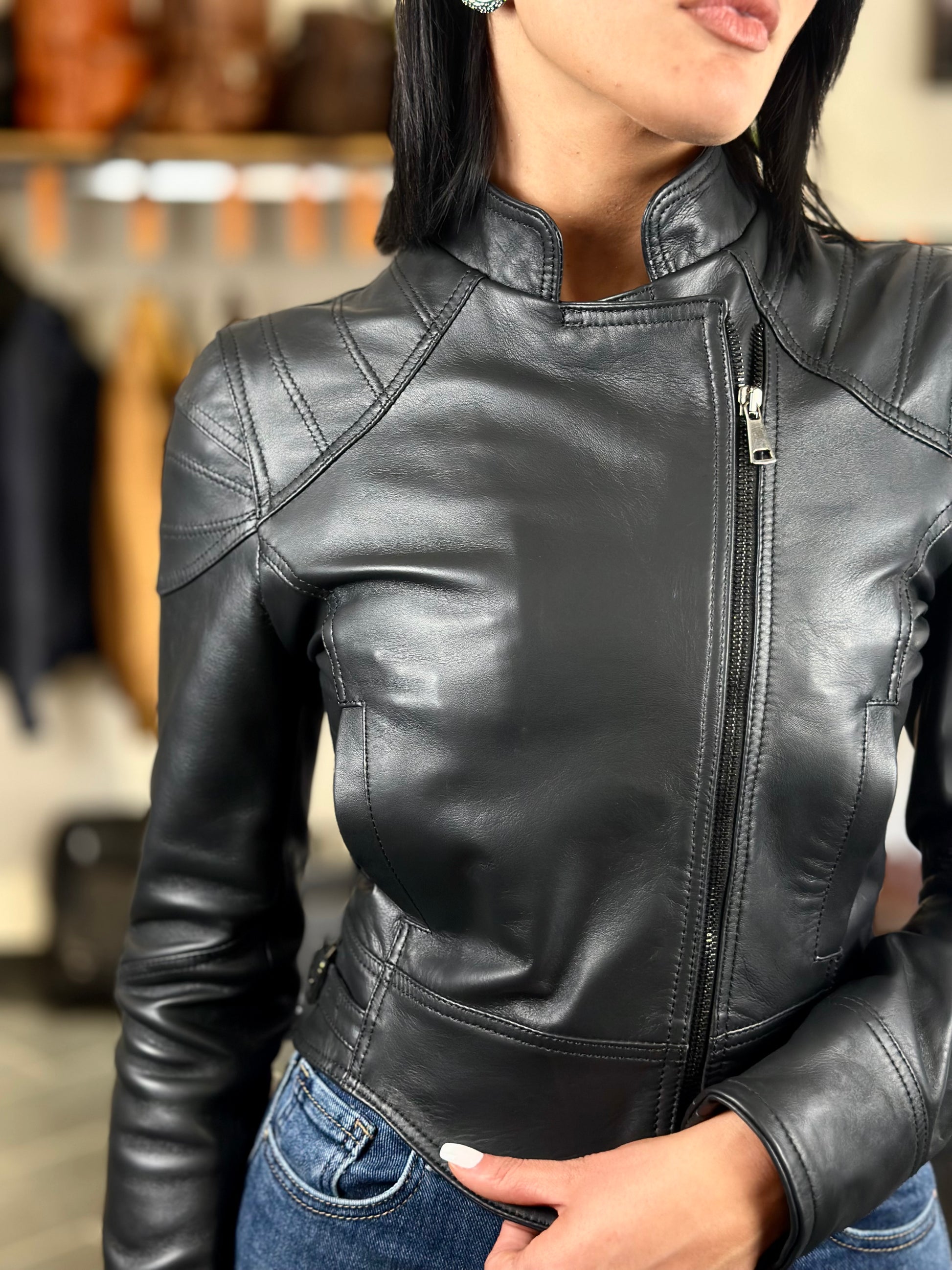 Crafted from soft Italian nappa leather, Iside stands out for its mandarin collar with asymmetrical closure and diagonal zip, a detail that reinforces its contemporary and sophisticated identity. The structured shoulders and geometric stitching lend strength to the design without weighing it down.