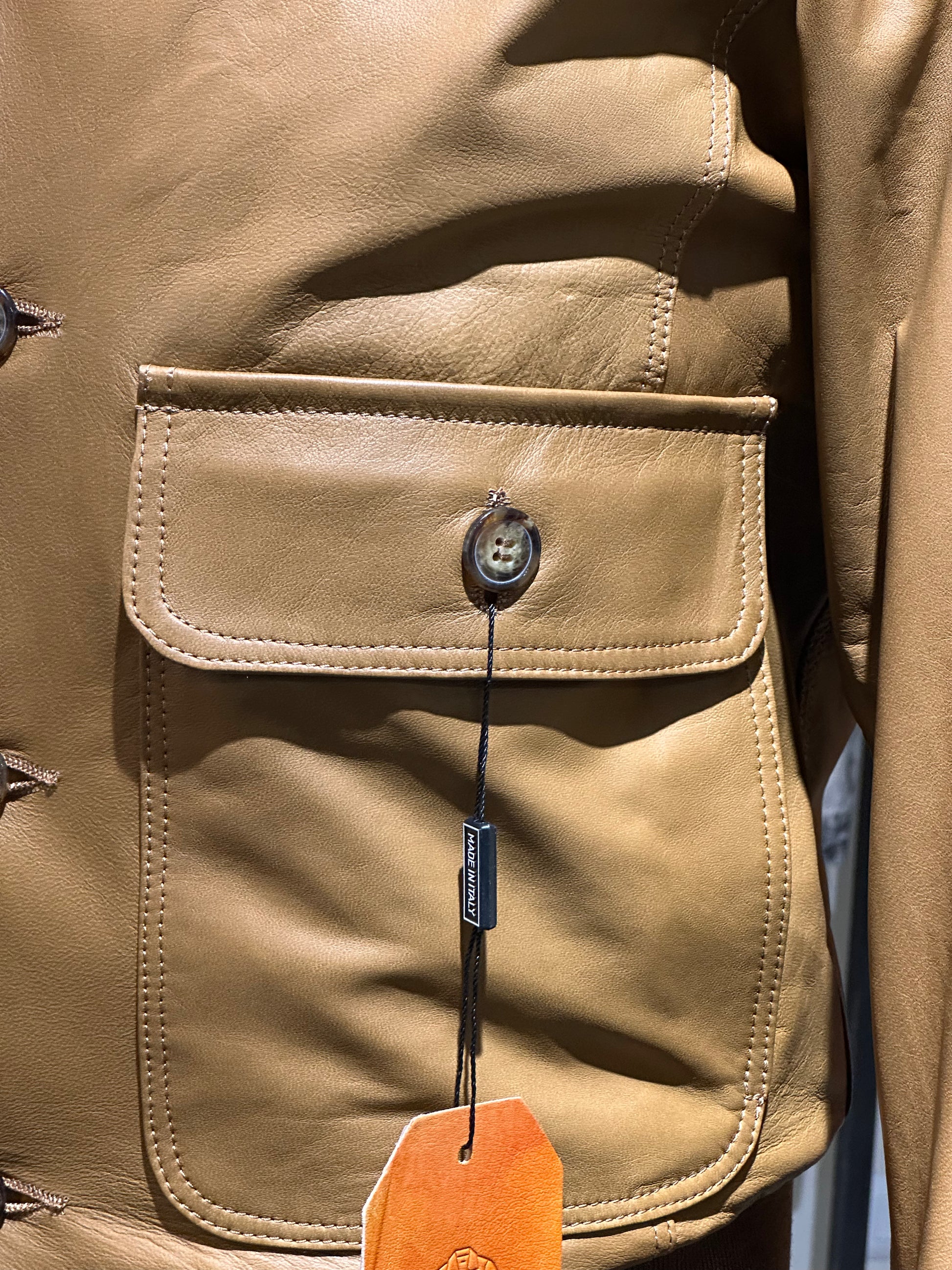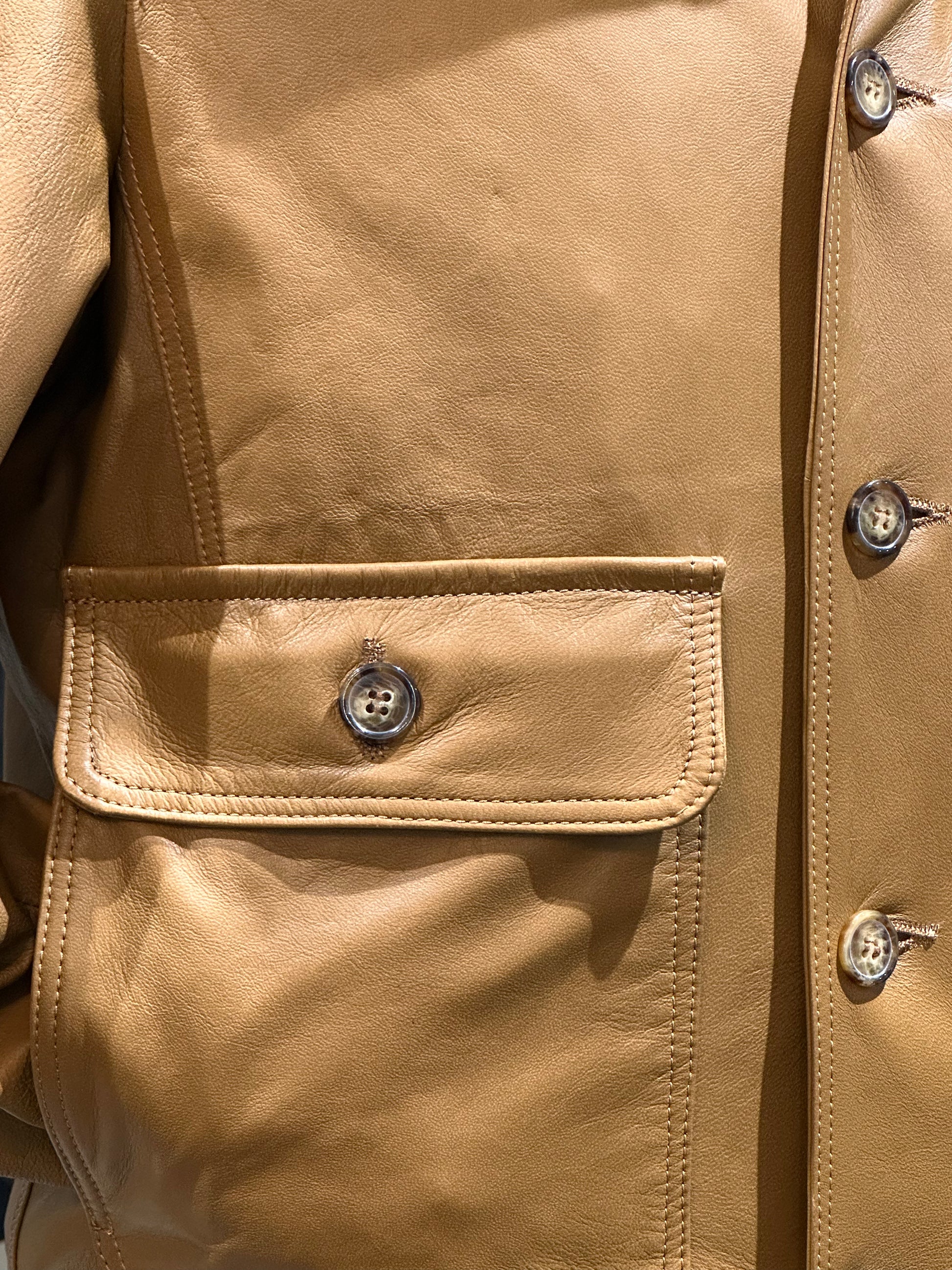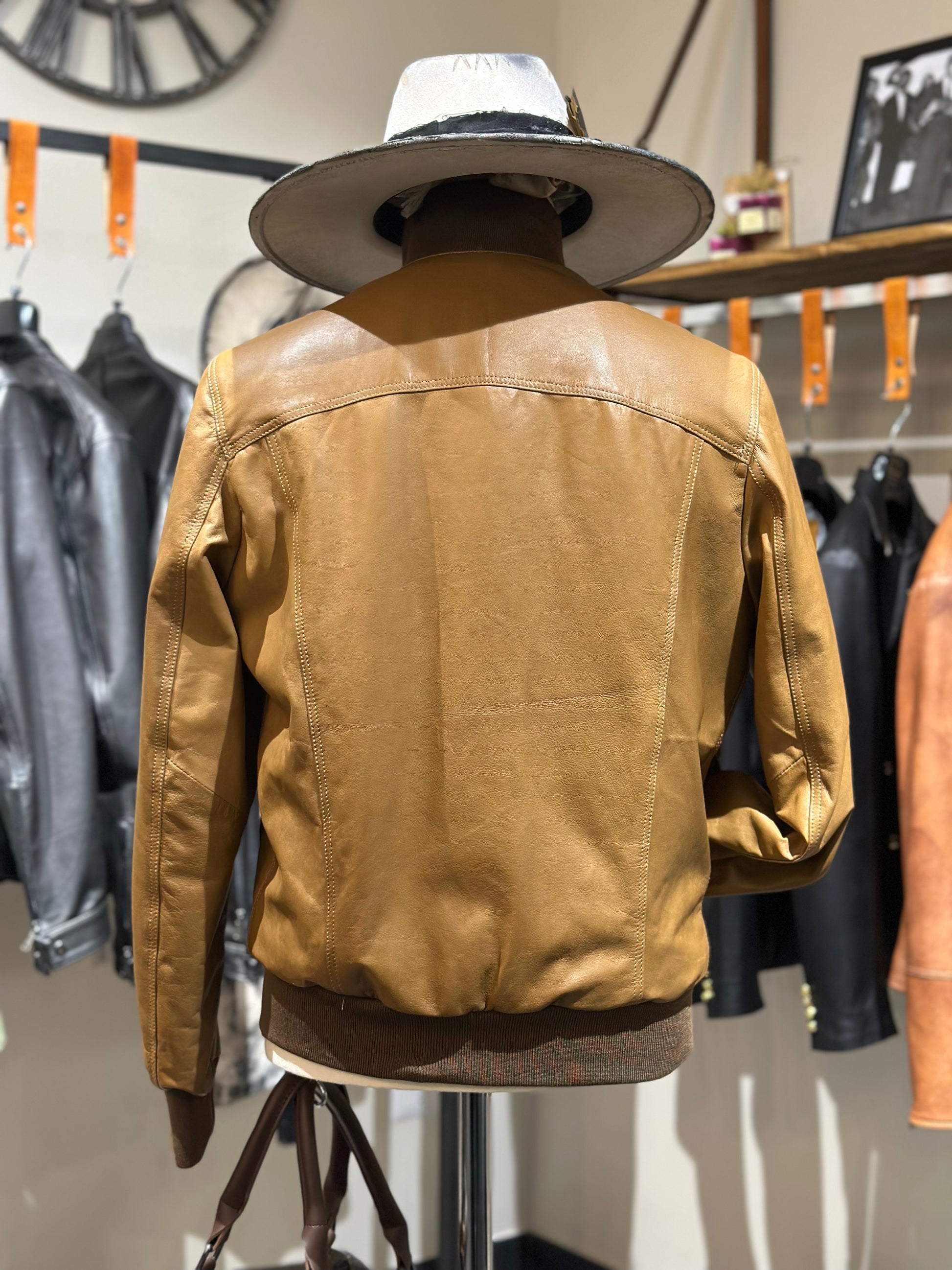 A soft, camel-colored lambskin bomber jacket with a modern and functional design. This men's piece features a comfortable fit with a clean, versatile silhouette. Large front pockets add practicality and character, while double interior pockets offer secure storage for personal items. The premium, lightweight lambskin lends a touch of luxury and unparalleled comfort. Perfect for completing a refined casual look, this bomber jacket is a timeless style icon for the contemporary man.