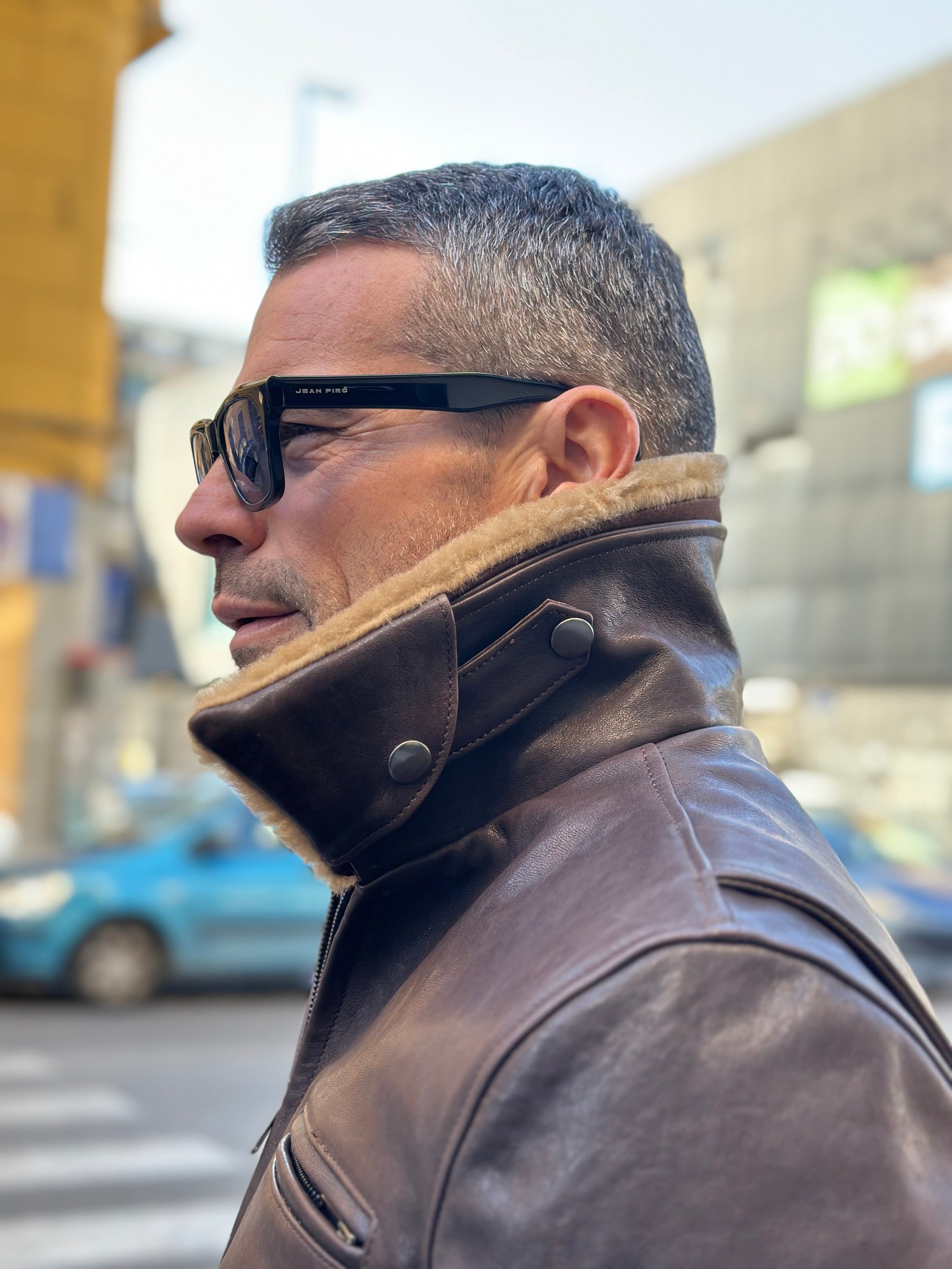 Odriam 's Heritage Rider Jacket is a timeless piece crafted from distressed calfskin , giving the leather a refined, lived-in look. The classic, rugged design is enhanced with refined details, including the detachable shearling collar , perfect for adapting to different seasons and occasions.