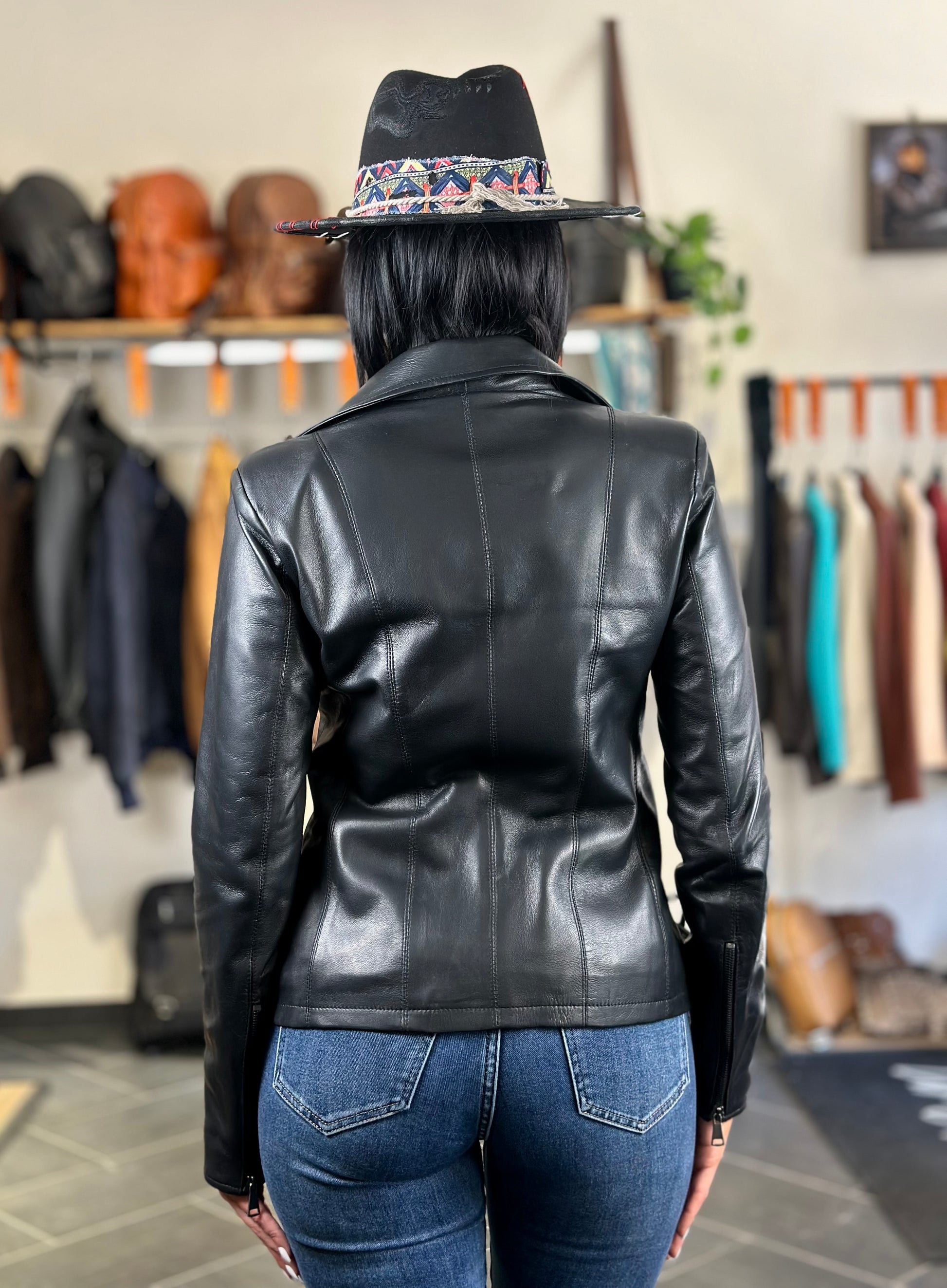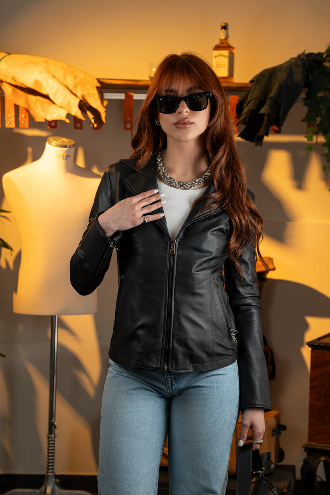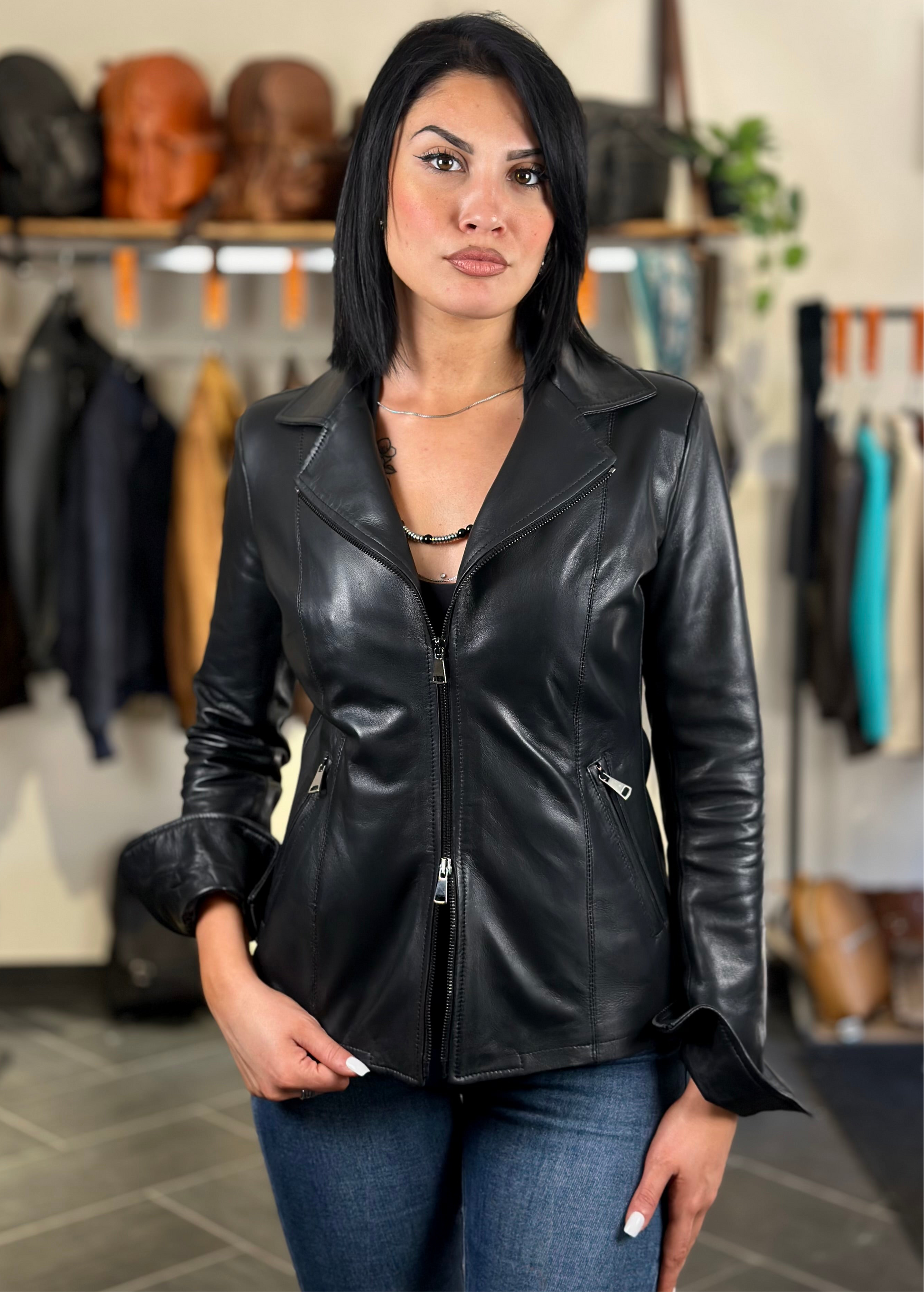 The "Perla" is a garment that embodies elegance and sophistication in a delicate and comfortable way. Crafted from high-quality leather, this jacket adds a touch of luxury and softness to your wardrobe. Its feminine, fitted silhouette is accentuated by the lapels, which add a classic and sophisticated element to the design. The quality craftsmanship and high-quality finishes ensure durability and resistance over time, while the softness of the leather makes it a pleasure to wear all day long. Perfect for both casual and formal occasions, this jacket adds a touch of effortless elegance to any ensemble. Slip it on and feel the center of attention with this garment that exudes a subtle yet powerful allure.