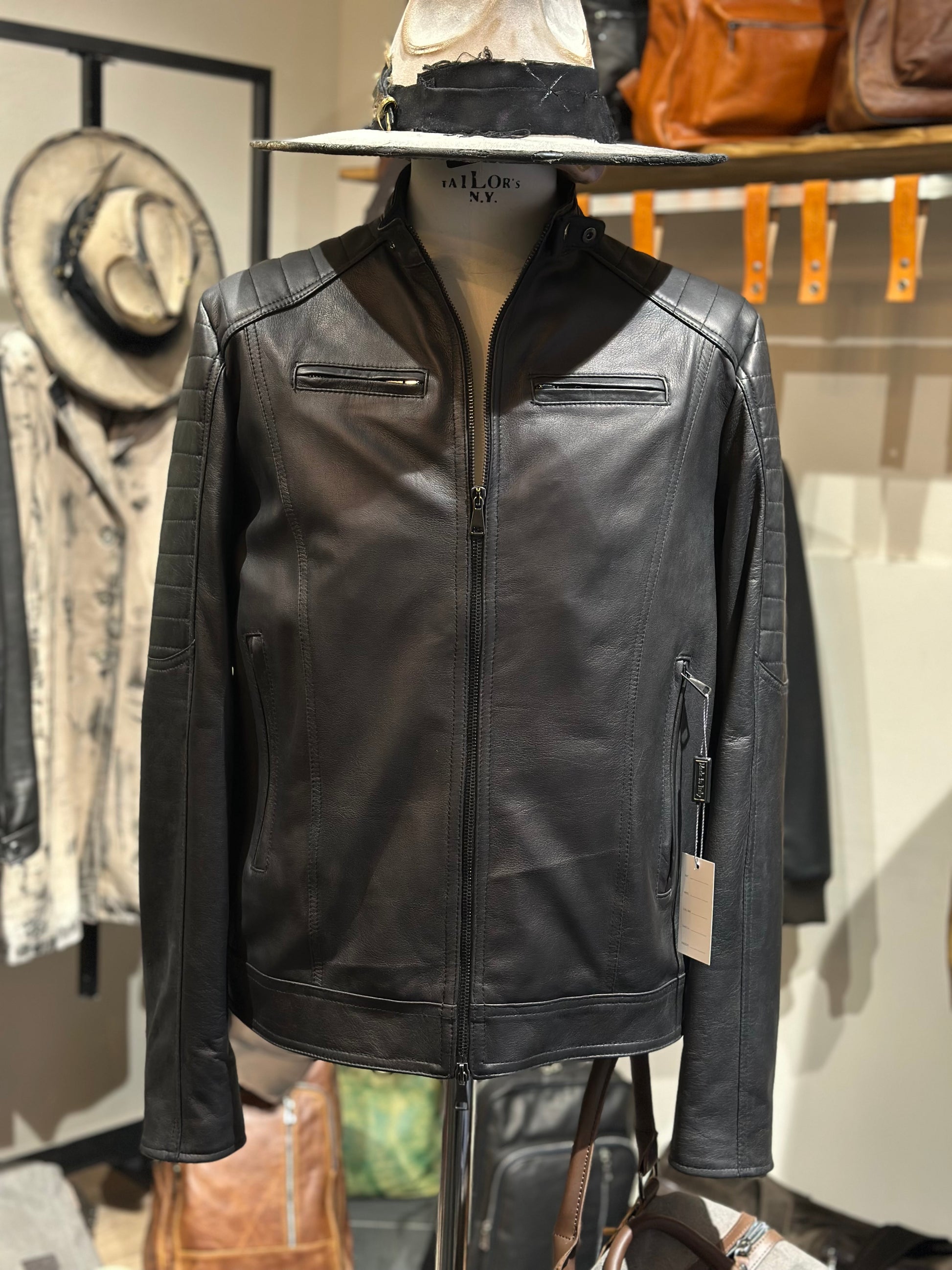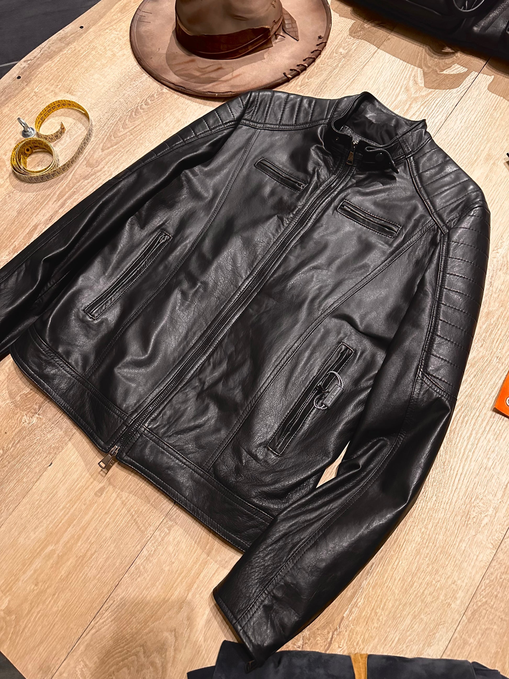 Genuine leather biker jacket with a bold, bold fit. Crafted from high-quality leather, it stands out for its bold design that combines practical details with a sophisticated aesthetic. It features two front pockets with metal zippers to keep essentials close at hand and two zippered chest pockets, adding a touch of functionality without compromising style. The stitching on the shoulders and sleeves adds character and a quilted effect that emphasizes the jacket's design. The interior features a double pocket, designed for greater practicality and organization. Ideal for those seeking a distinctive, robust piece with a rock soul.
