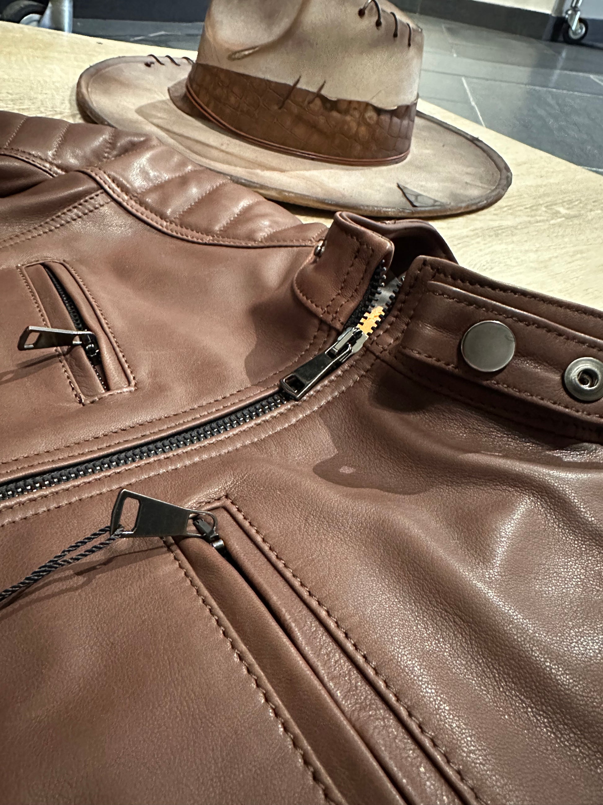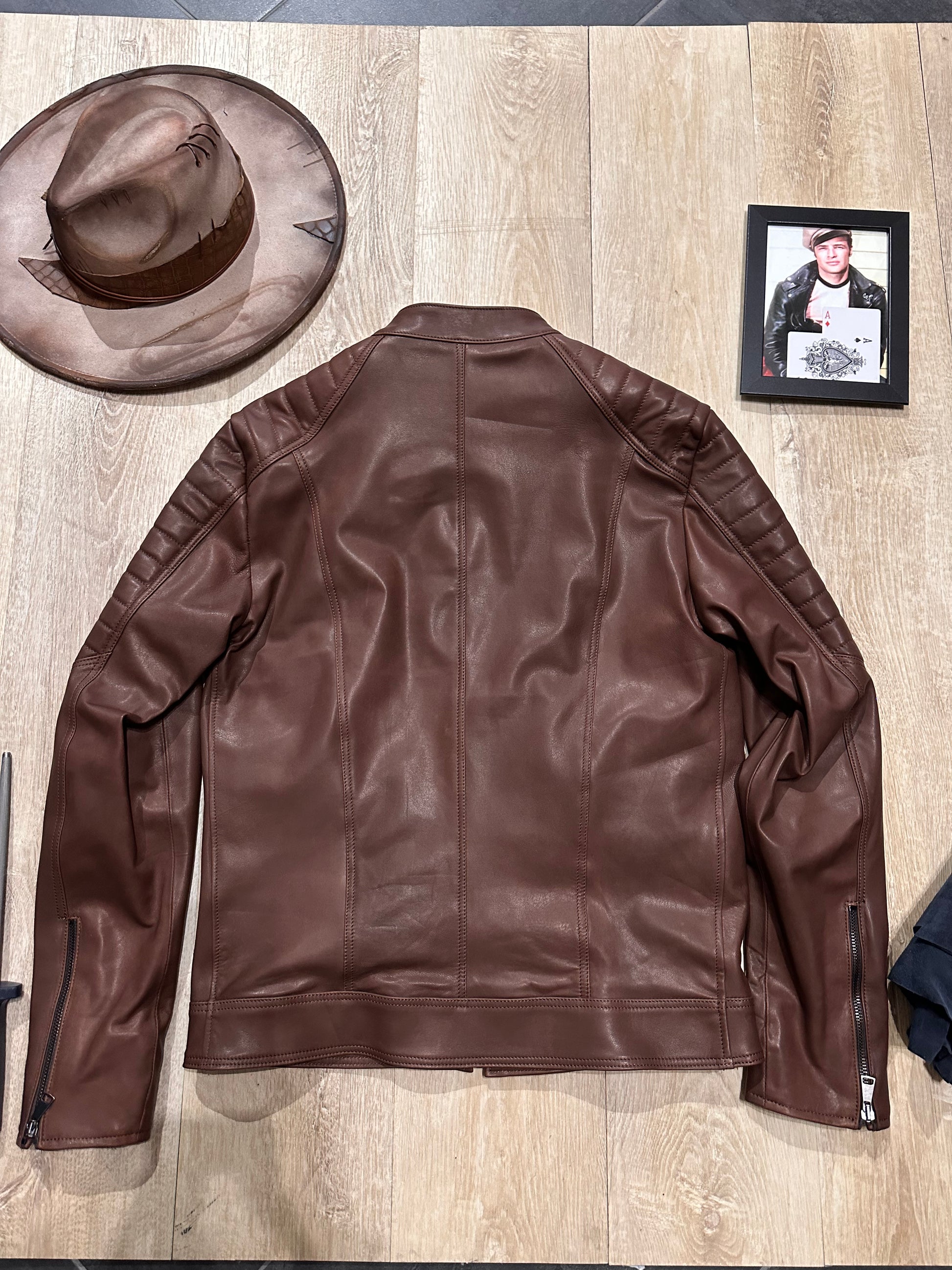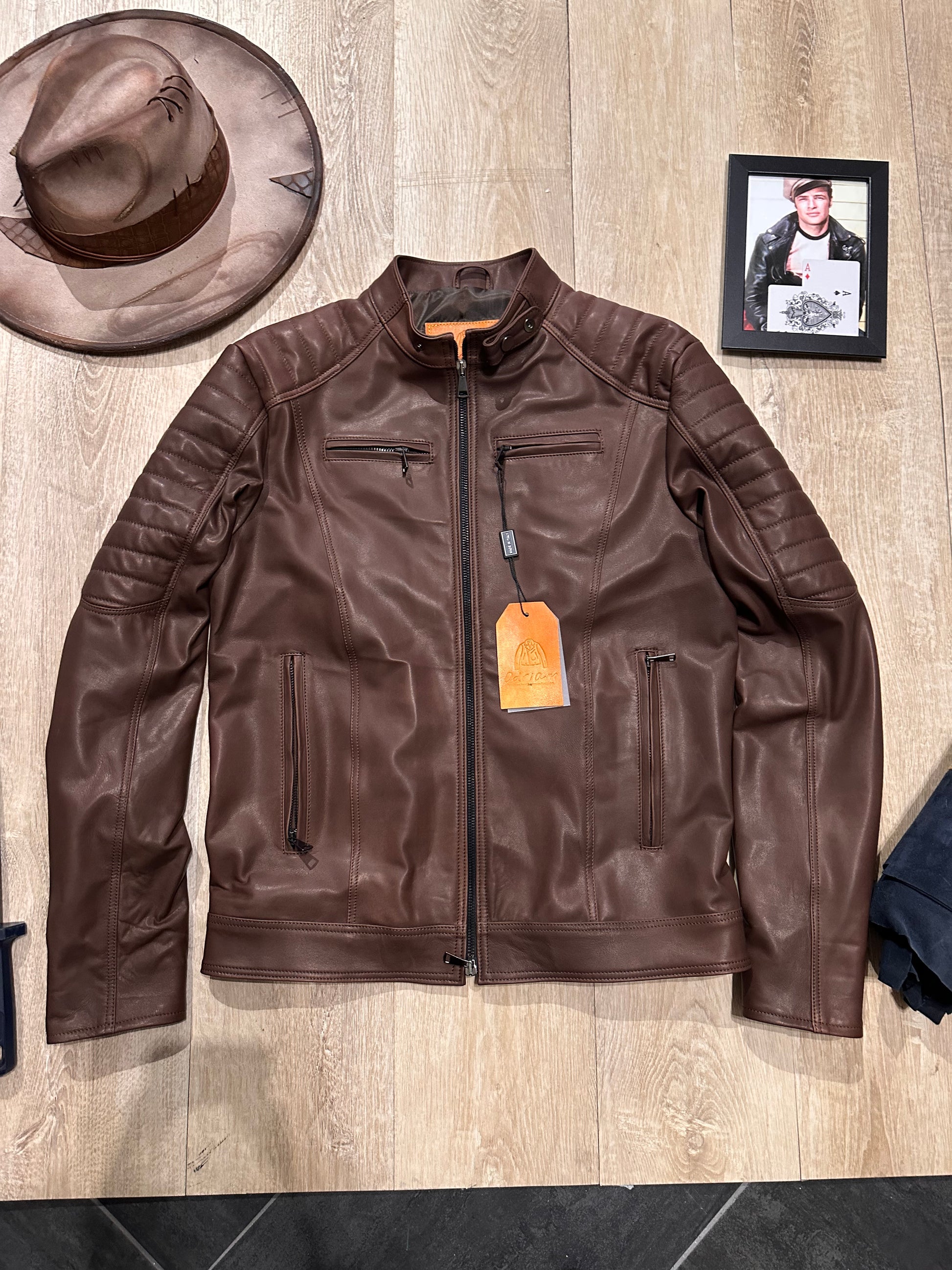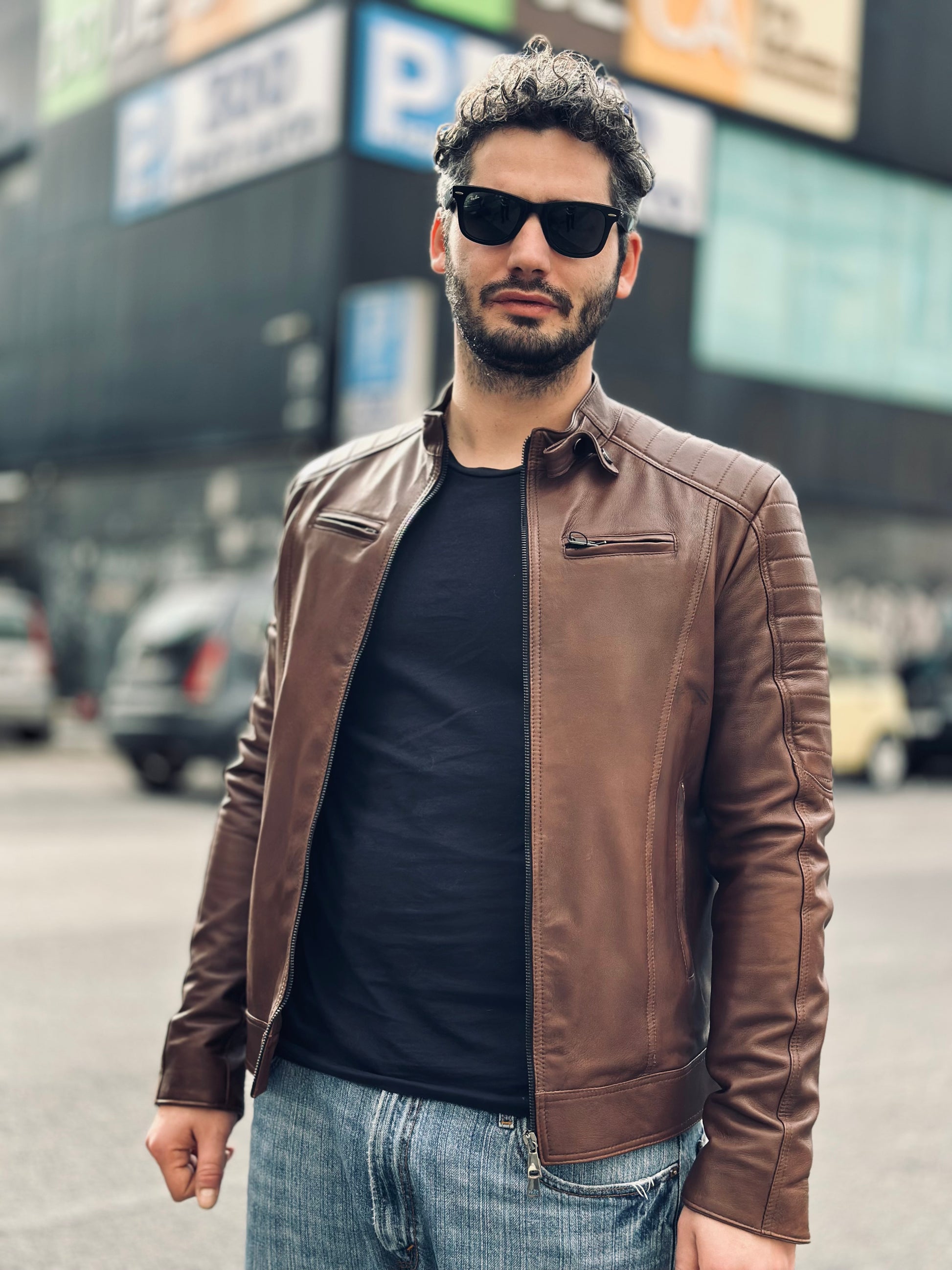 The Steel Stallion biker jacket in soft natural leather features a bold, refined fit. Crafted from high-quality leather, it stands out for its bold design that combines practical details with a refined aesthetic. It features two front pockets with metal zippers to keep essentials close at hand and two zippered chest pockets, adding a touch of functionality without compromising style. The stitching on the shoulders and sleeves adds character and a quilted effect that emphasizes the jacket's design. The interior features a double pocket, designed for greater practicality and organization. The soft natural leather ensures comfort and an impeccable fit, making this garment ideal for those seeking the perfect blend of rugged durability and a sophisticated rock style.