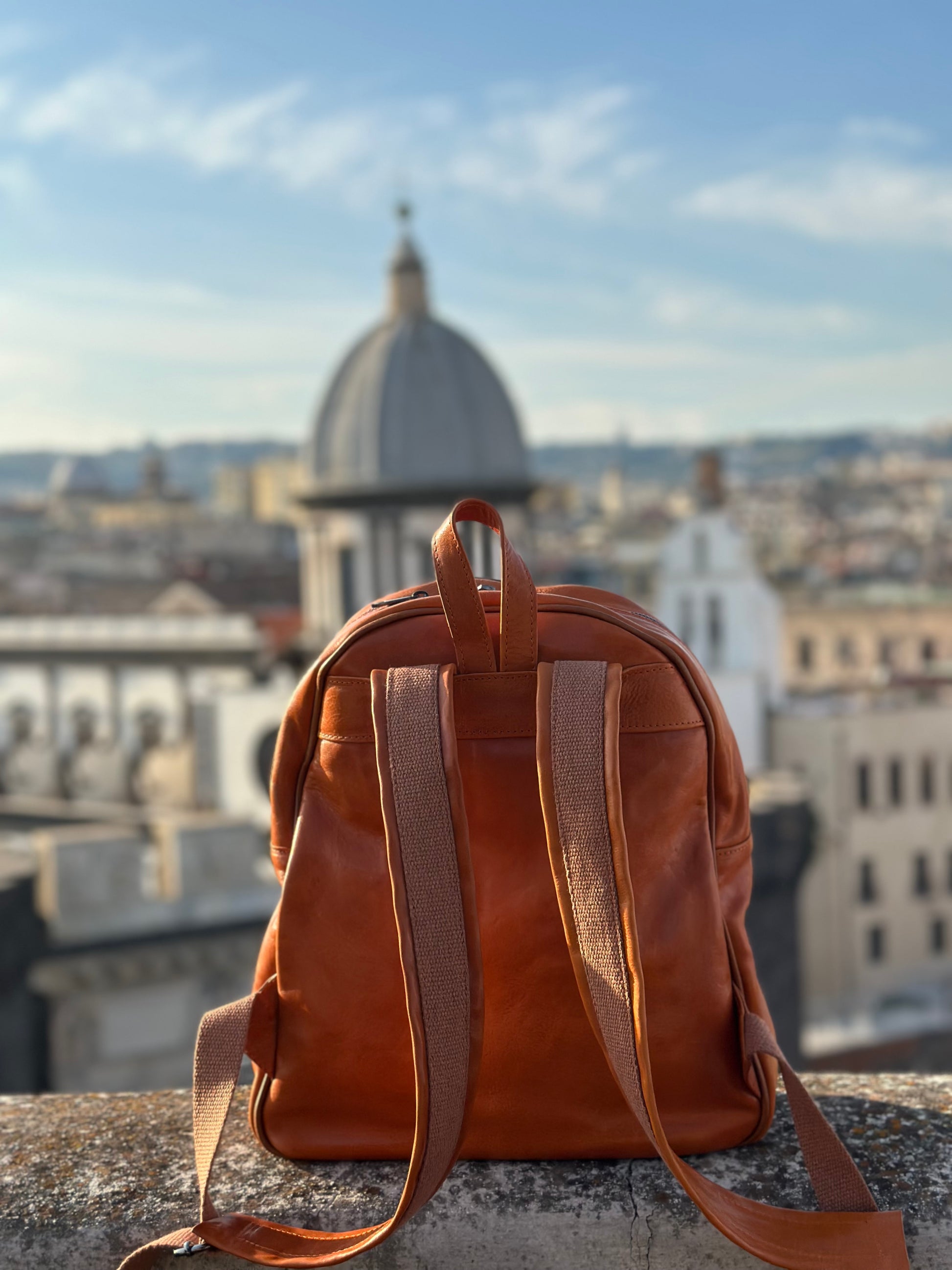 Imagine a backpack made of high-quality genuine leather, crafted with a vegetable-based treatment that enhances its natural characteristics and makes it unique. The leather has a rich, warm appearance, with a smooth, soft-touch surface that acquires an elegant patina over time, a characteristic of carefully crafted leather goods. The material's nuances may vary slightly, making each piece unique.