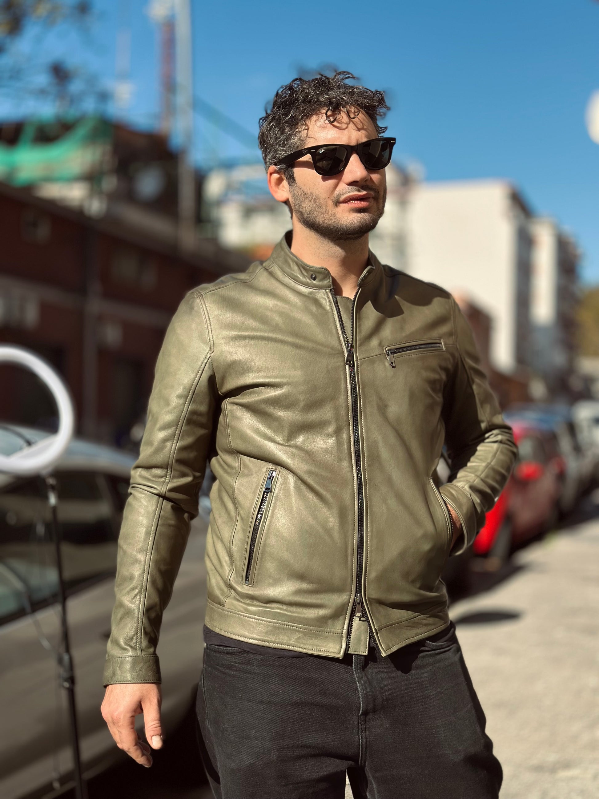 This jacket is crafted from premium, extra-soft natural nappa leather, featuring an elegant olive green hue that lends the garment a refined and contemporary look. The incredibly smooth and soft texture of the leather offers comfort and an adaptable fit that lightly hugs the body. The minimalist design, with contrasting black zippers on the pockets and front closure, adds a modern and bold touch, while the snap-button mandarin collar enhances the garment's clean, urban style. This jacket is perfect for a casual yet sophisticated look, ideal for those seeking a superior quality, elegant, and versatile garment.