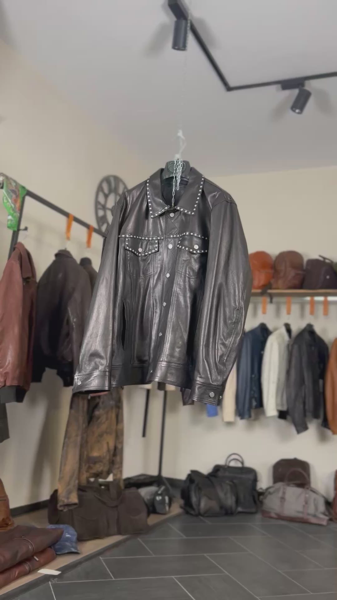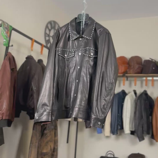 Un classique intemporel, réinterprété avec caractère. Cette veste Trucker en cuir se distingue par ses clous appliqués à la main sur les poches avant, le long du col et sur l'empiècement dos, créant un équilibre parfait entre élégance et esprit rock.